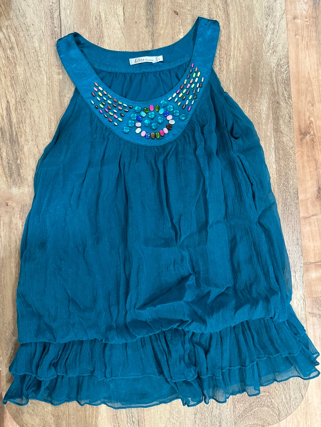 Beautiful teal sleeveless blouse. Features a jewel-encrusted neckline and a tiered ruffle hem. Lightweight and flowy fabric. Size large.