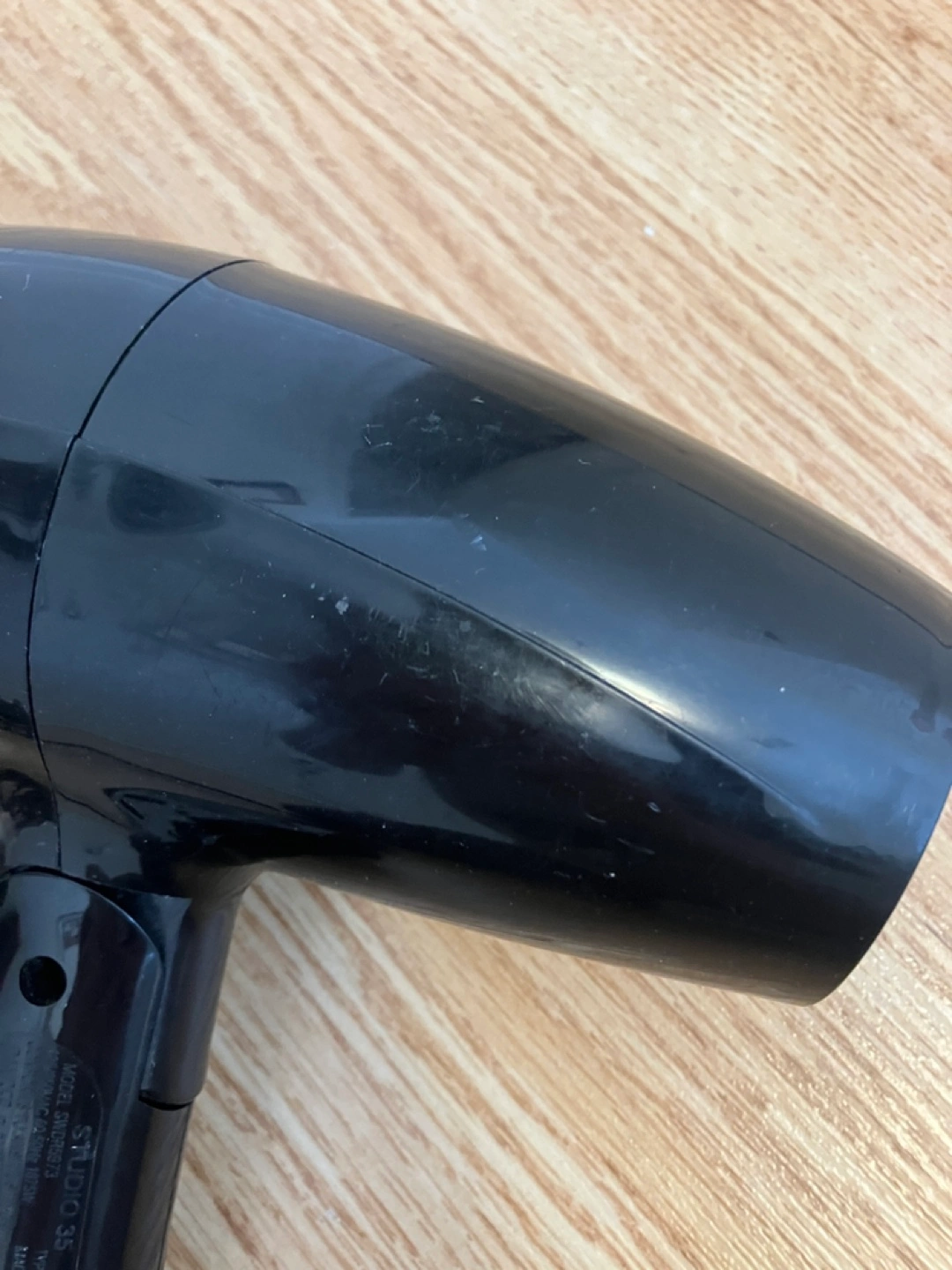Compact black hair dryer, still works great! Includes low, off, and high heat settings, as well as a cool shot button. Has some marks from storage as well as some sticker residue.