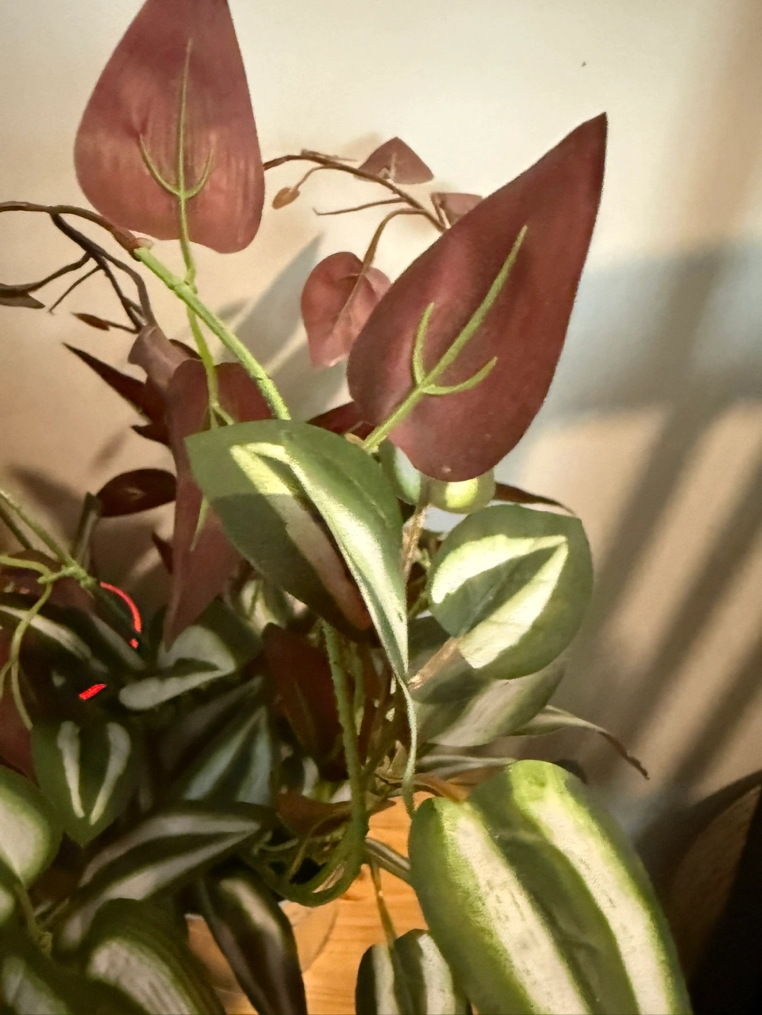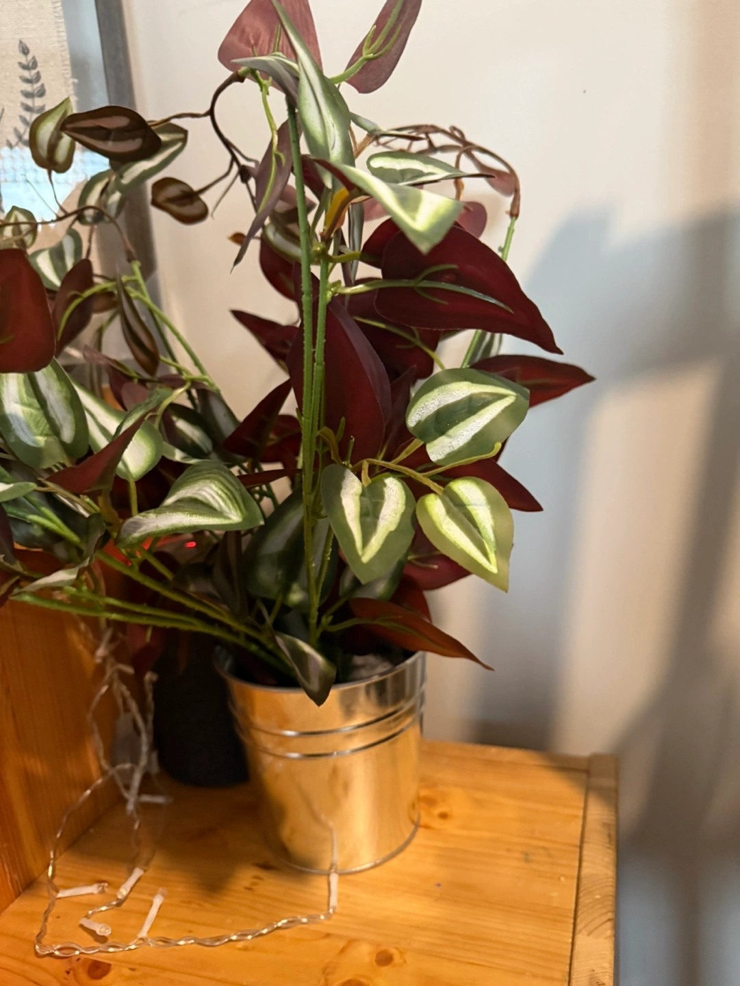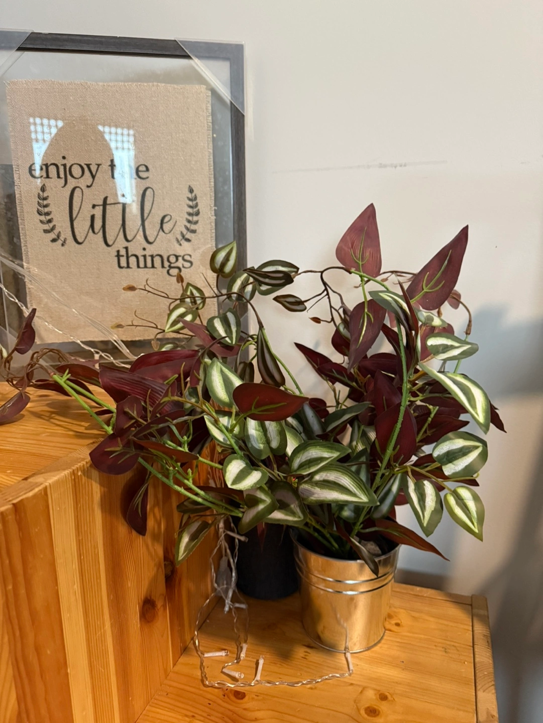 Artificial plant in a silver metal pot. Burgundy and green leaves. Looks great on a shelf or table.