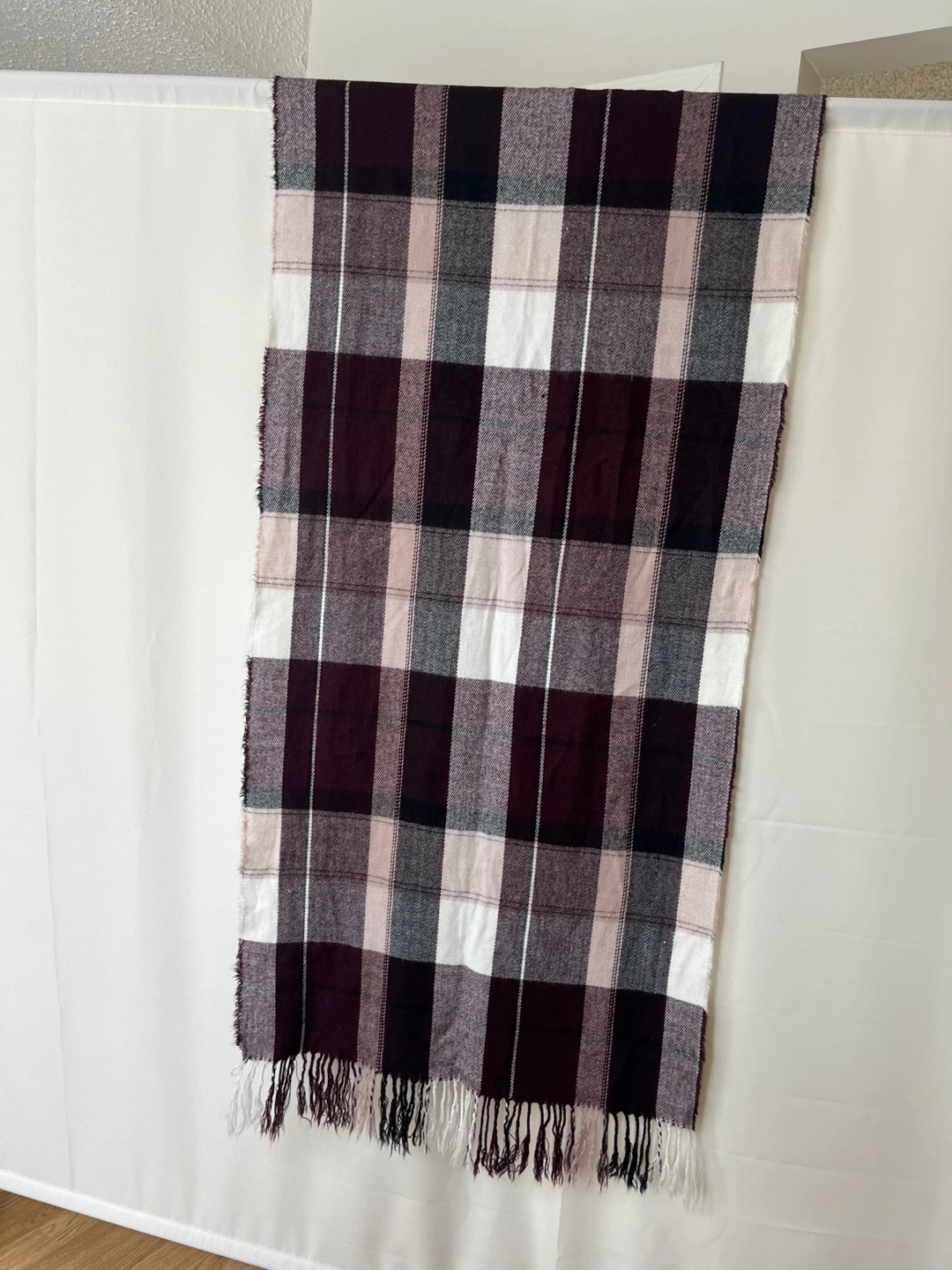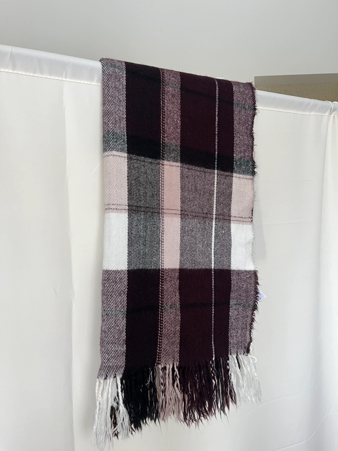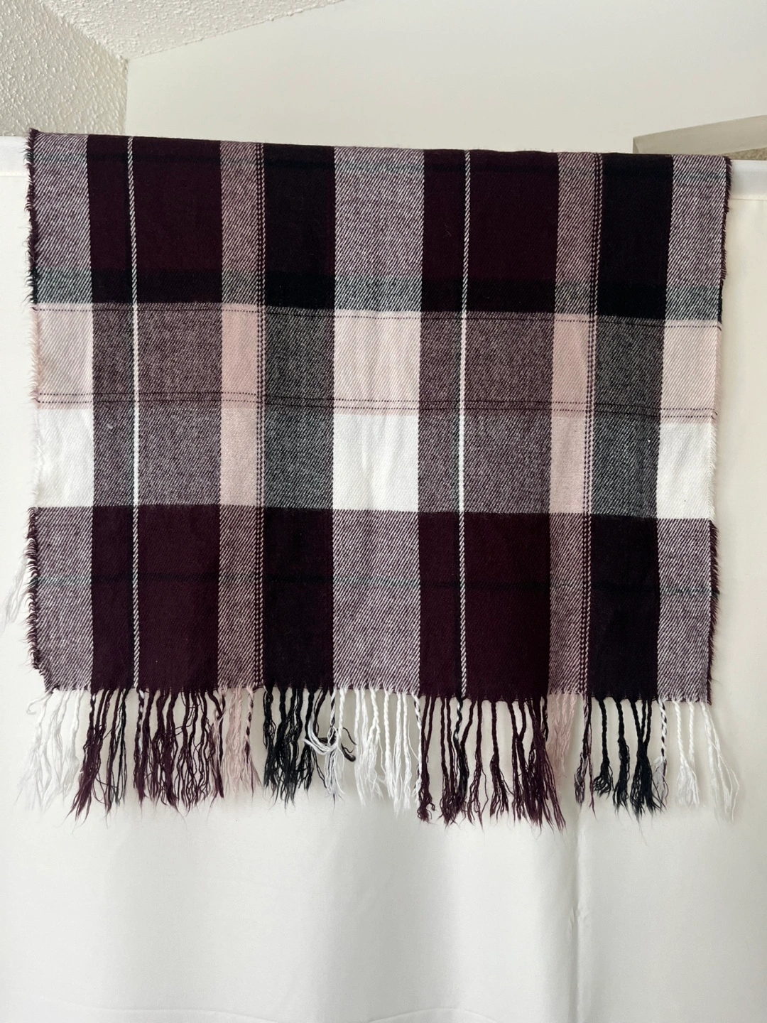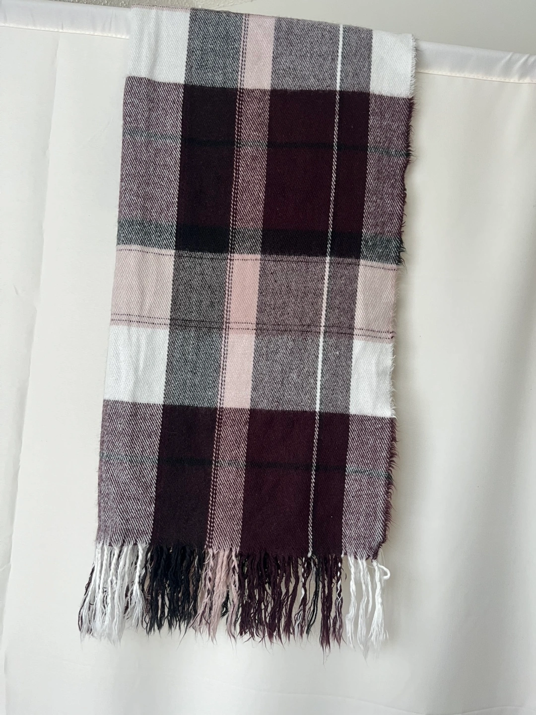 Soft and warm scarf. Features a burgundy, white and grey plaid pattern. Fringed edges. Perfect for fall and winter.