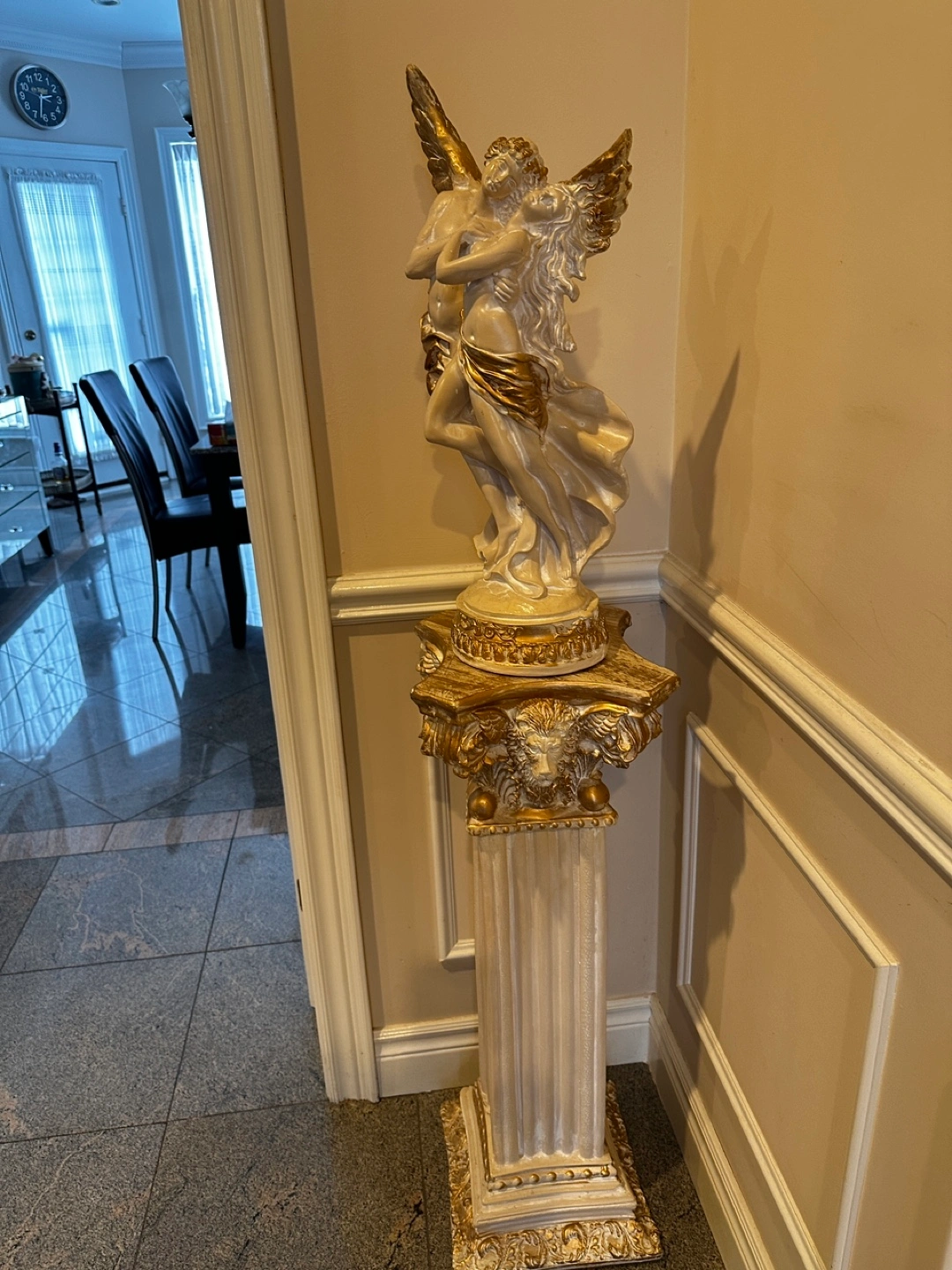 Elegant, decorative set. Features a tall pedestal with a lion head detail and a sculpted angel couple statue. Off-white and gold colour scheme. Perfect for a classical or romantic interior.
