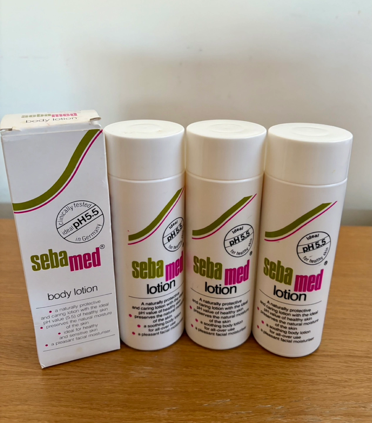 Three bottles of Sebamed body lotion. 200ml each. Naturally protective lotion, ideal for healthy skin. pH 5.5. Made in West Germany. In original boxes.