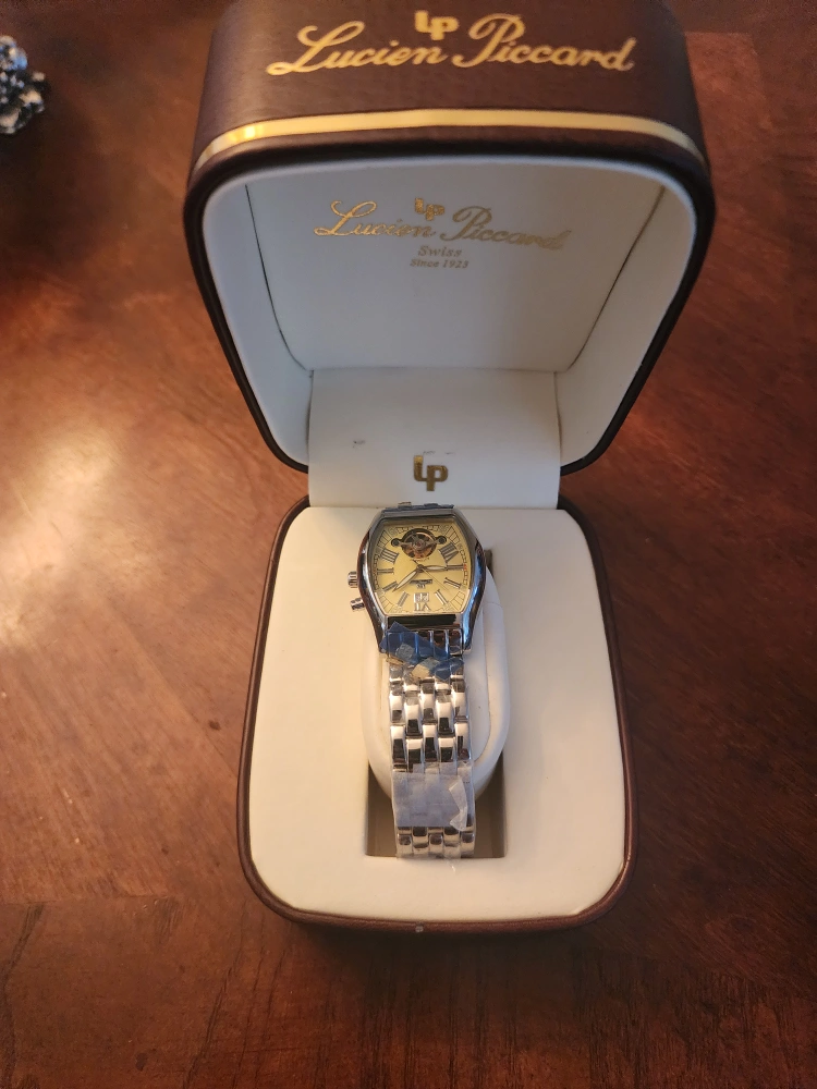 Elegant women's watch. Silver tone bracelet. Features a light yellow face. Comes in original box.