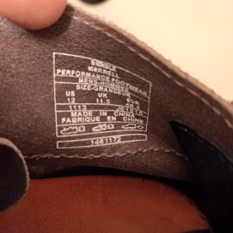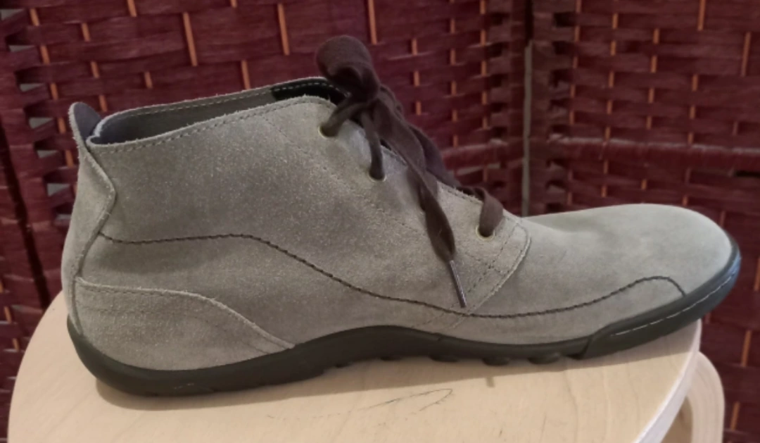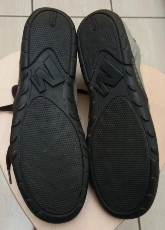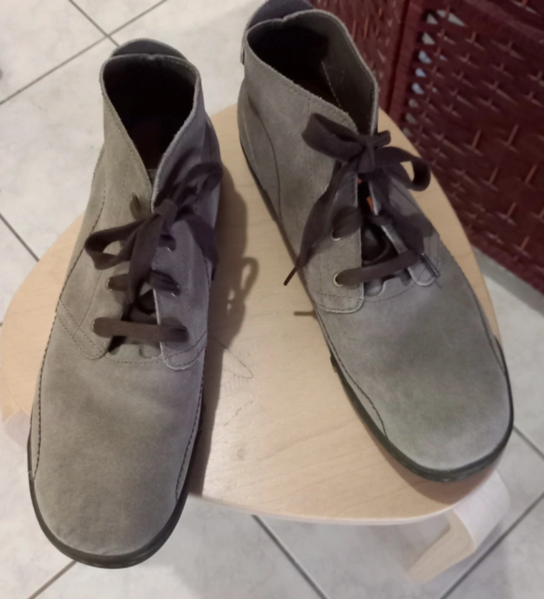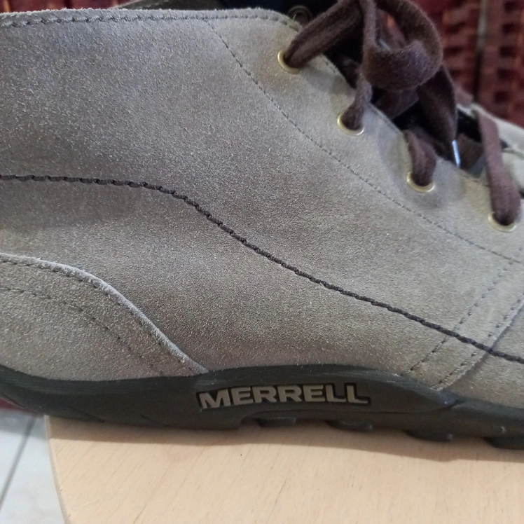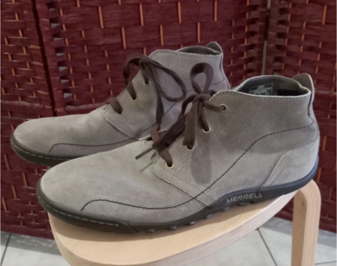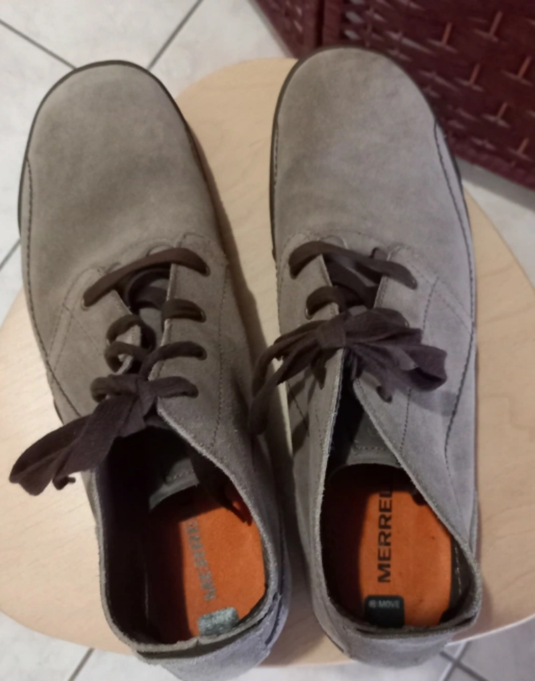 Pair of grey suede Merrell ankle boots. Brown laces. Minimal wear. Comfortable and stylish footwear.