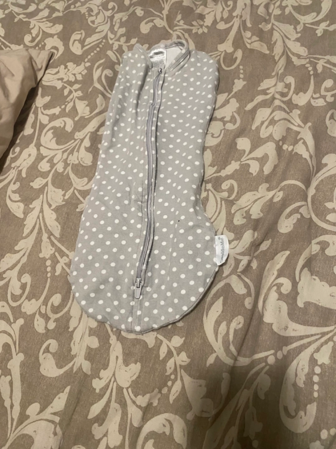 Adorable baby sleep sack. Grey fabric with white polka dots. Features a zipper closure. Suitable for newborns.