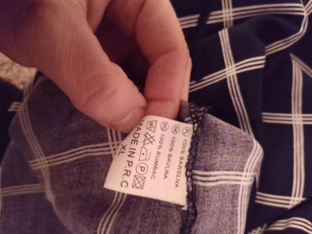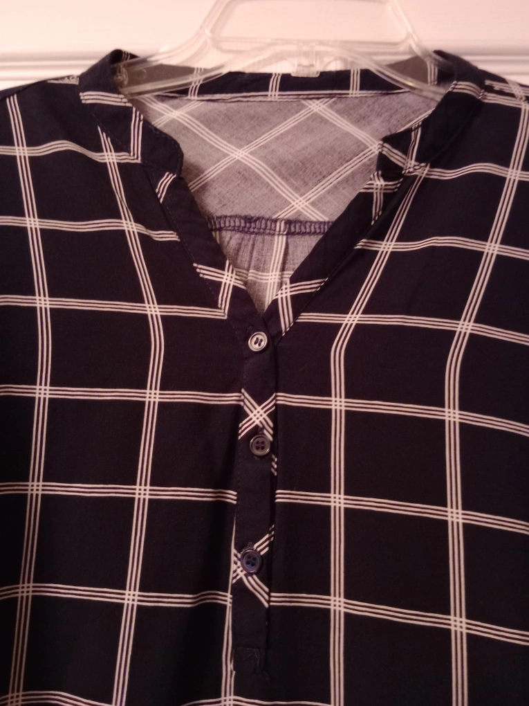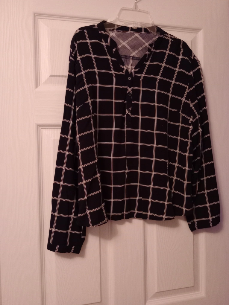 Long-sleeved, button-up blouse. Black and white gingham pattern. Size XL. 100% cotton. Made in Poland