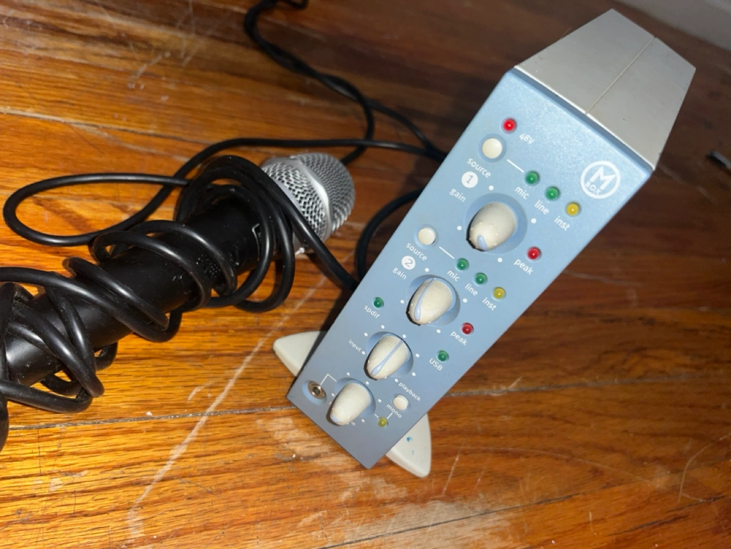 M-Audio MobilePre USB audio interface. Two inputs. Includes microphone and cable. Good for recording.
