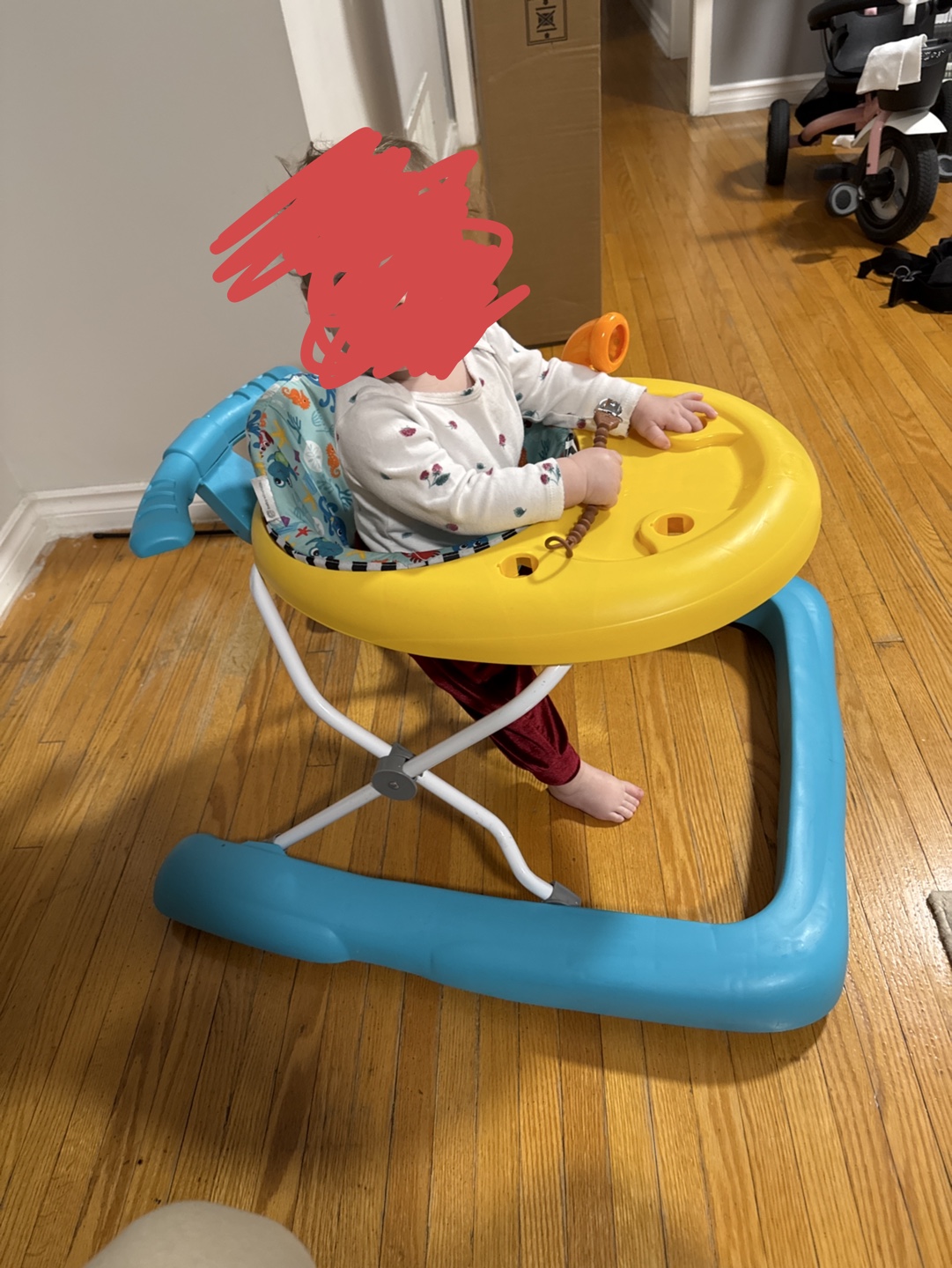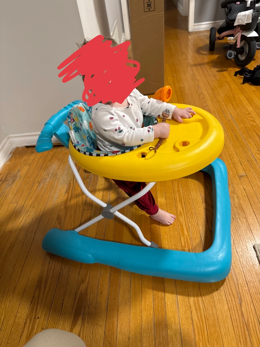 Adorable baby walker, yellow and teal colours. Features a tray with toys. Great for helping little ones learn to walk. Easy to fold and store.