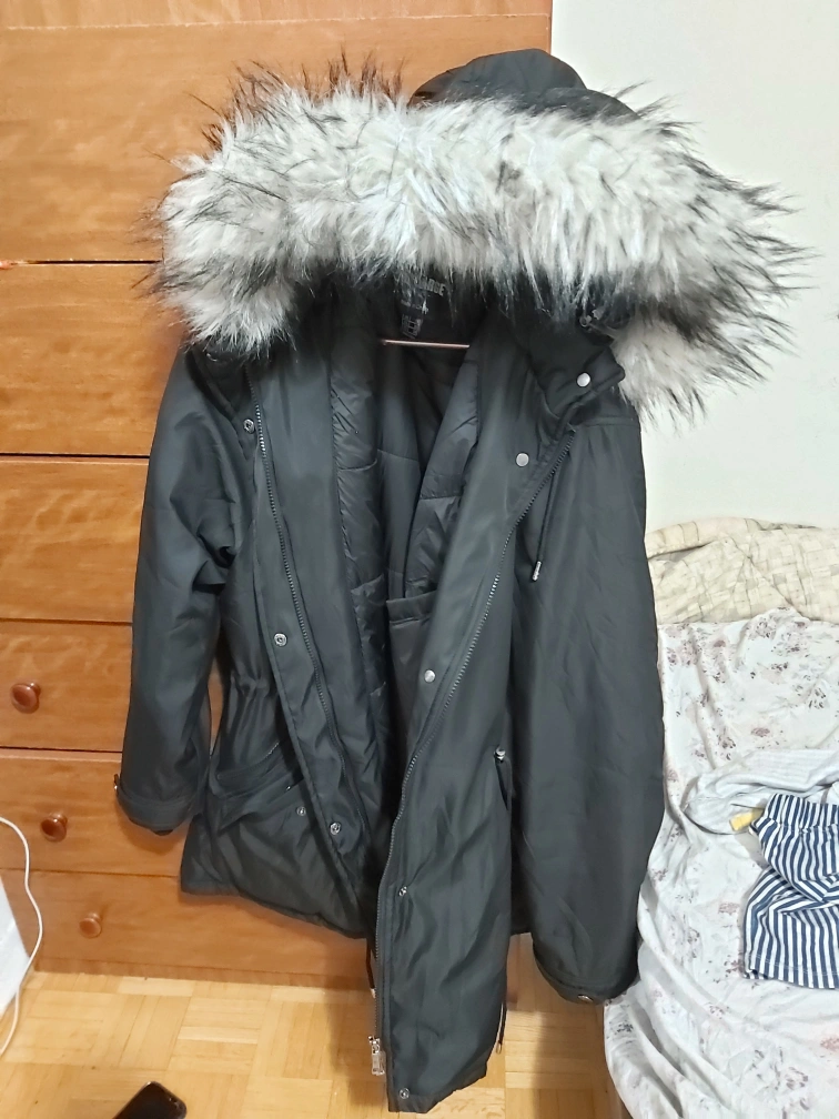Warm winter parka. Black colour. Features a detachable faux fur trimmed hood. Size 3X. Multiple pockets. Great for cold weather.