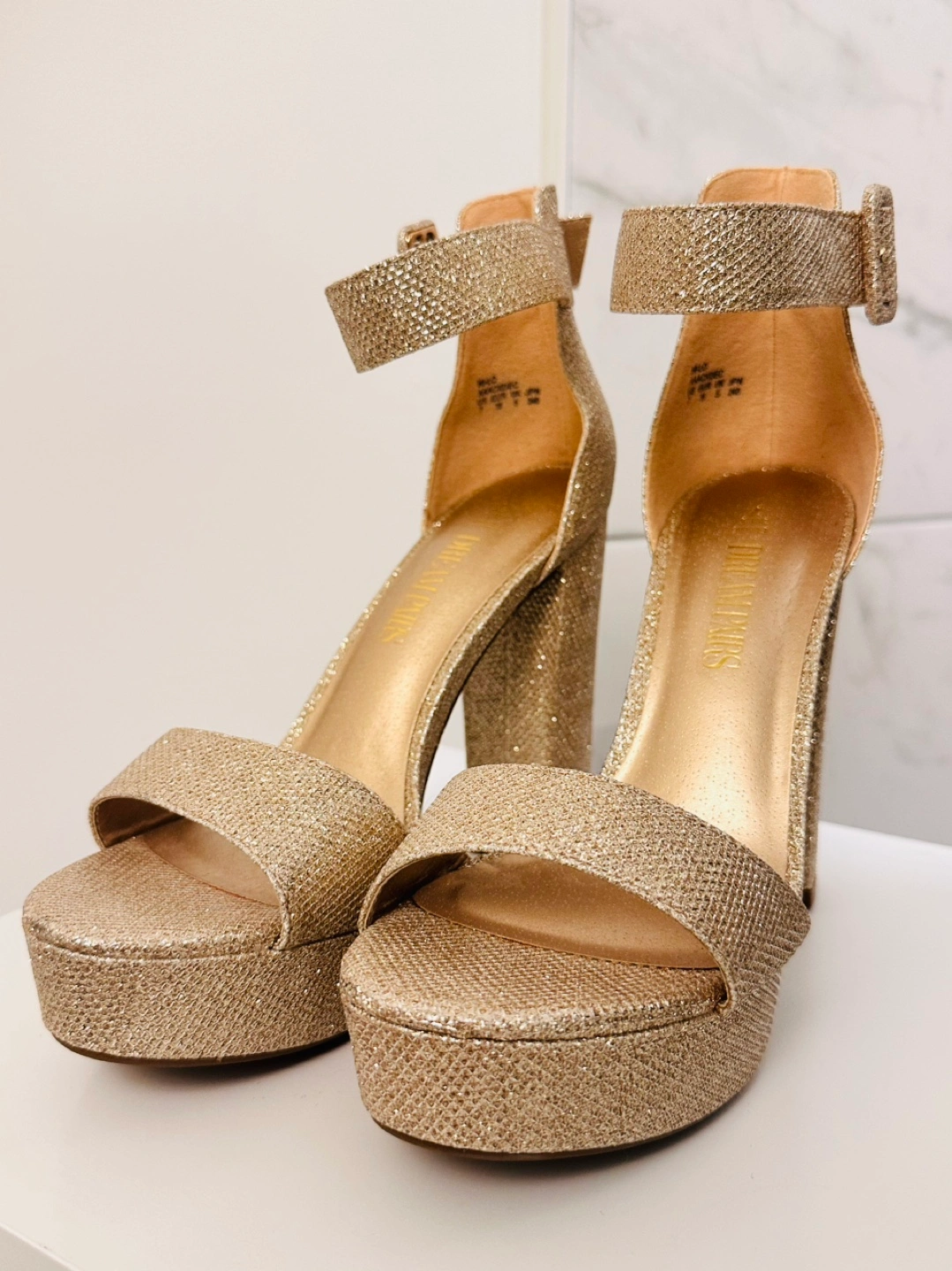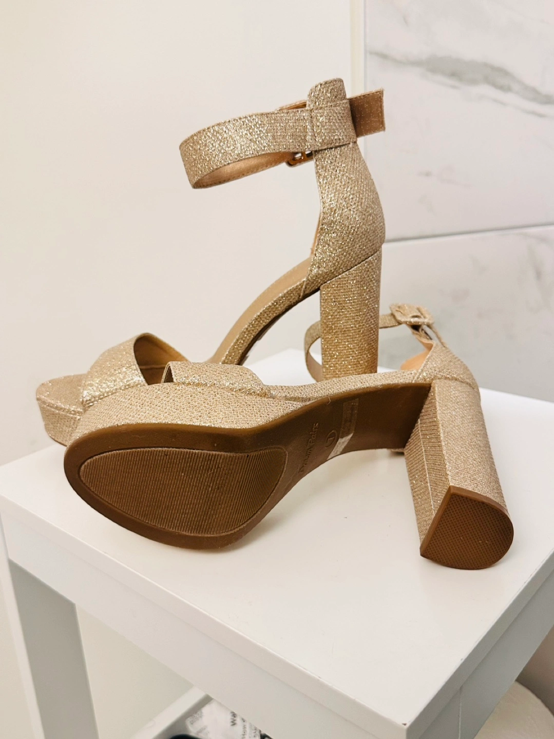Gorgeous gold glitter platform heels. Ankle strap with buckle closure. Thick block heel. Perfect for a special occasion.