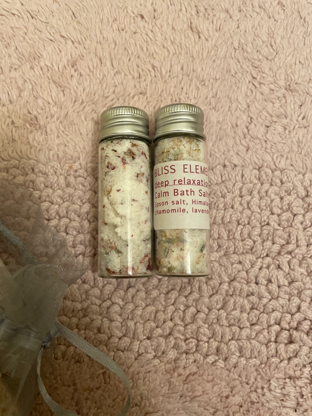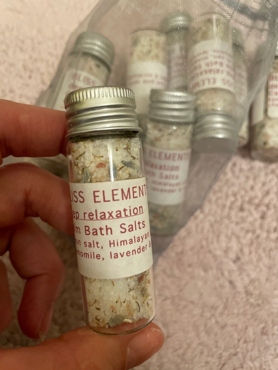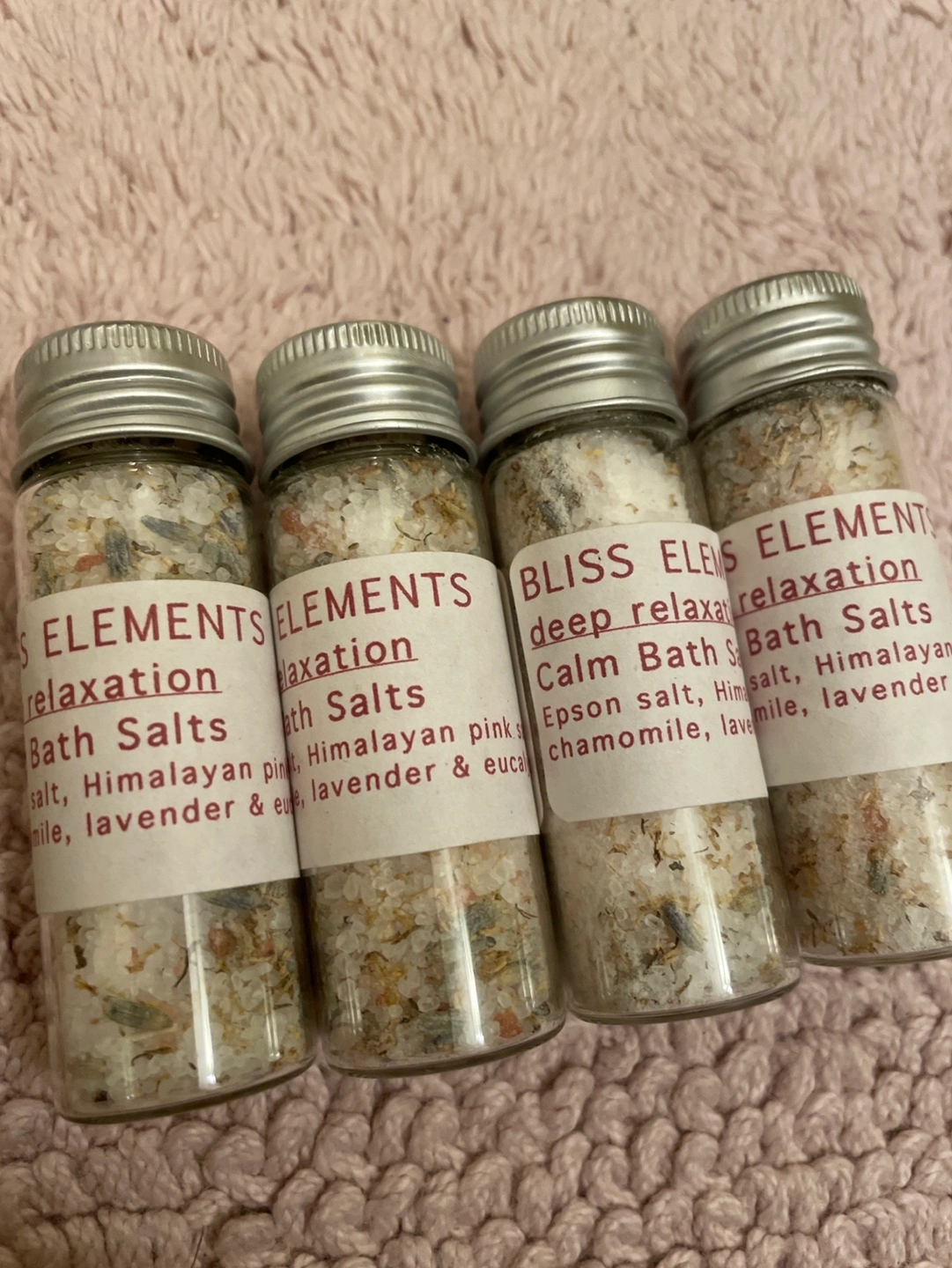 12 mini jars of calm bath salts. Epsom salt, Himalayan salt, chamomile and lavender. Deep relaxation.