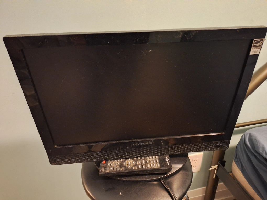 Small LCD television. Includes remote control and power cable. Good for a bedroom or smaller space. Used condition, some cosmetic wear.