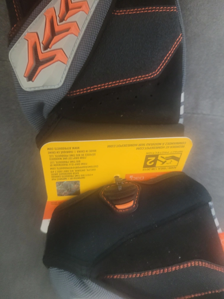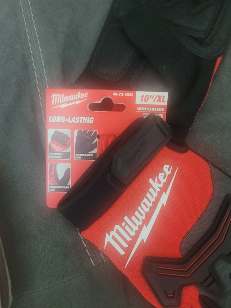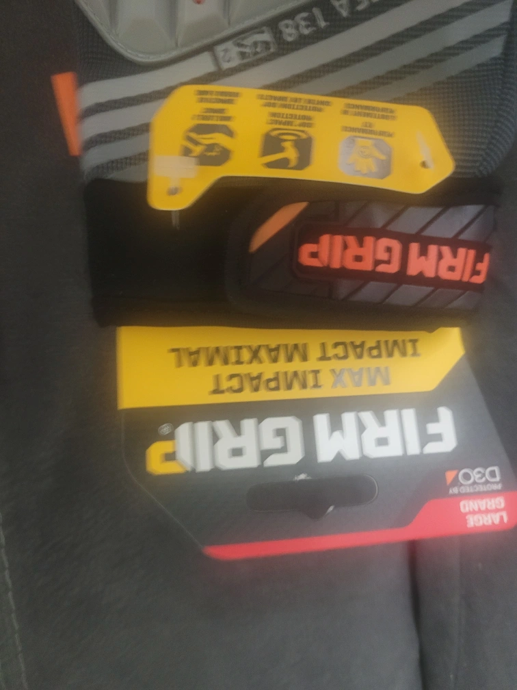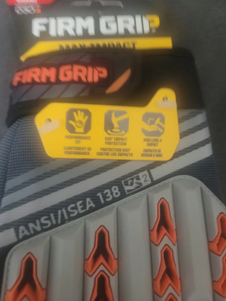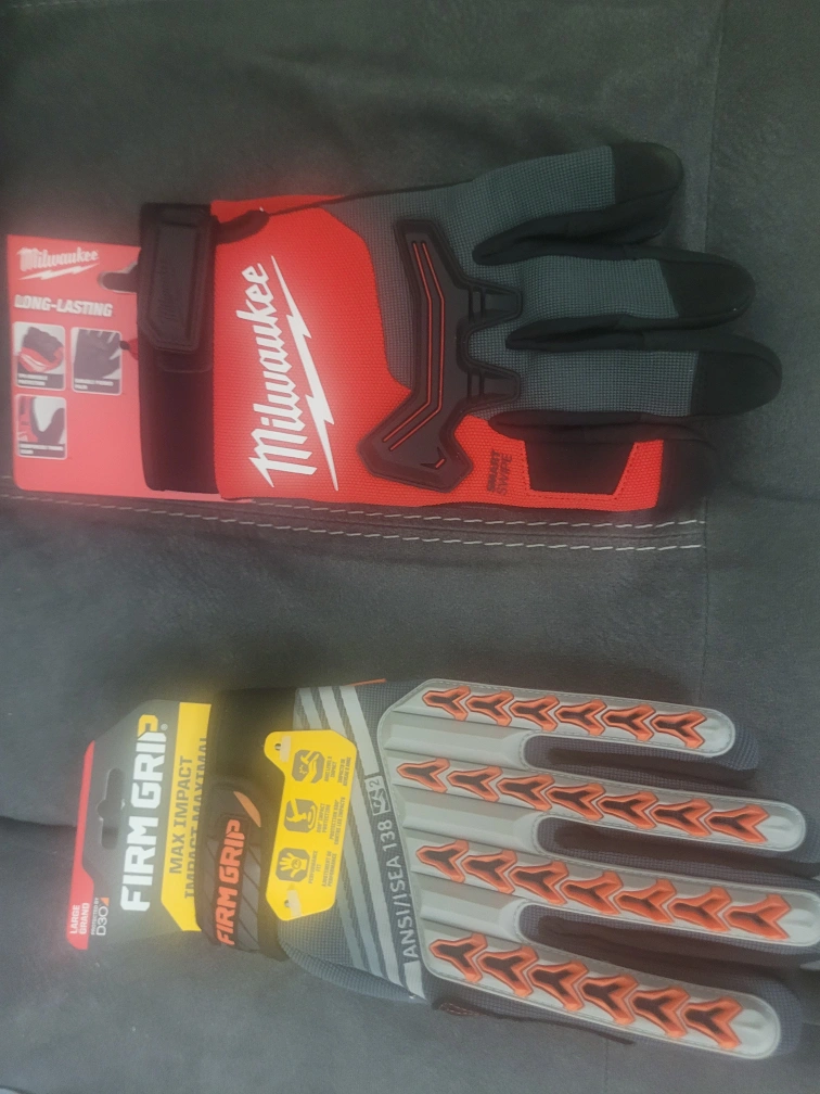 495Two pairs of work gloves. One pair Milwaukee brand, size 10/XL. Red and grey. Long-lasting, durable padded palm. The other pair Firm Grip brand, size large. Grey, black, and orange. Max impact, maximal protection. ANSI/ISEA 138.