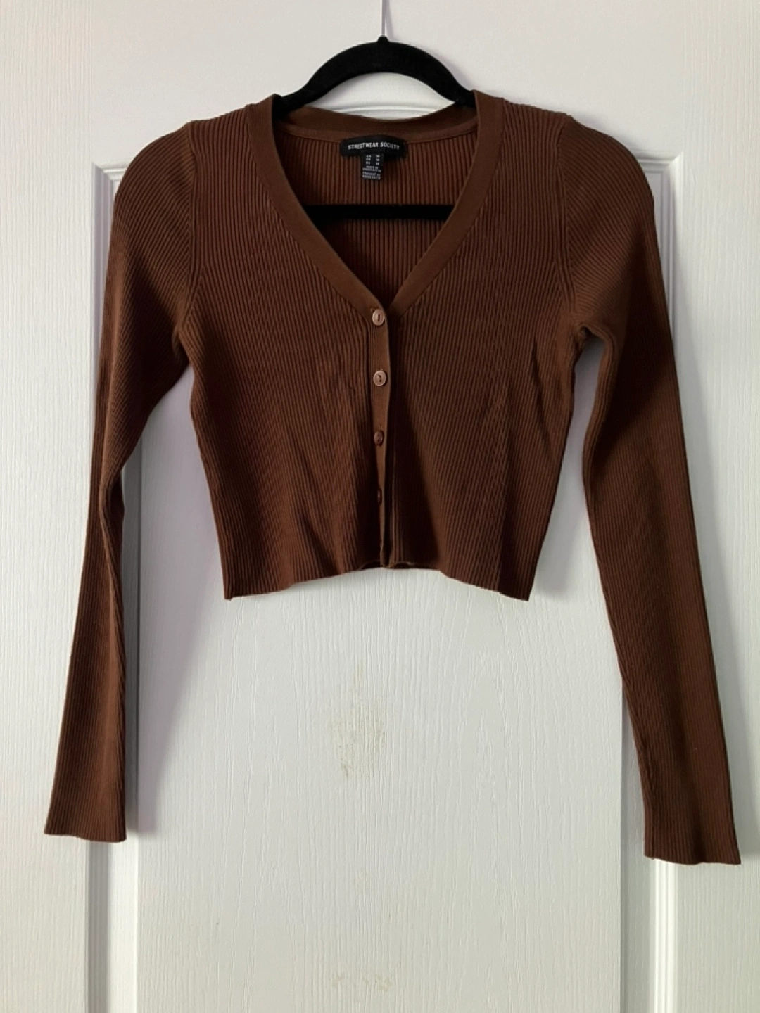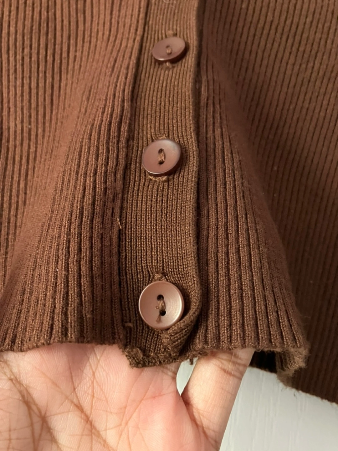 Great for fall! Labelled as medium but fits more like a small. A few loose threads at the bottom (see second picture).