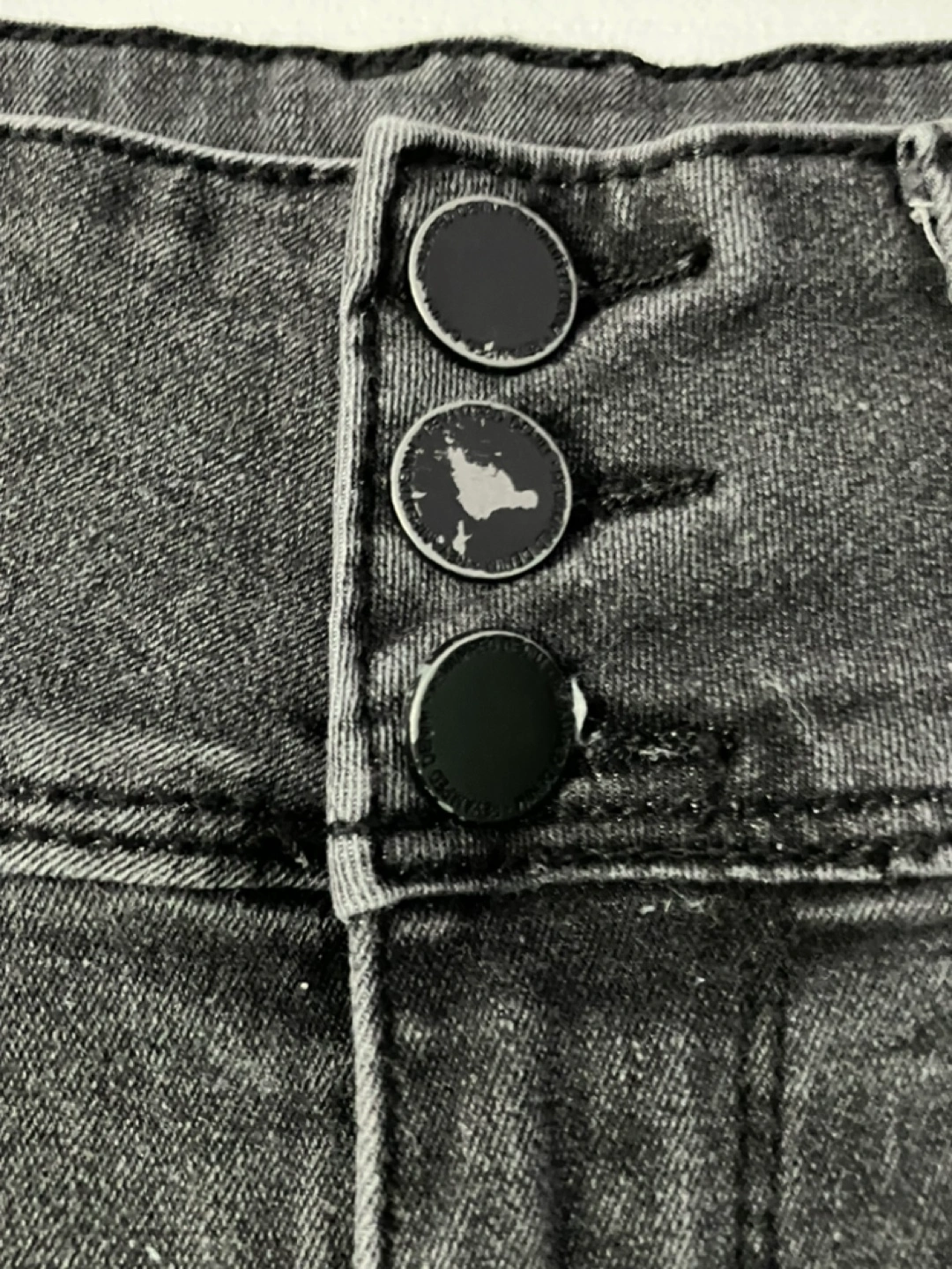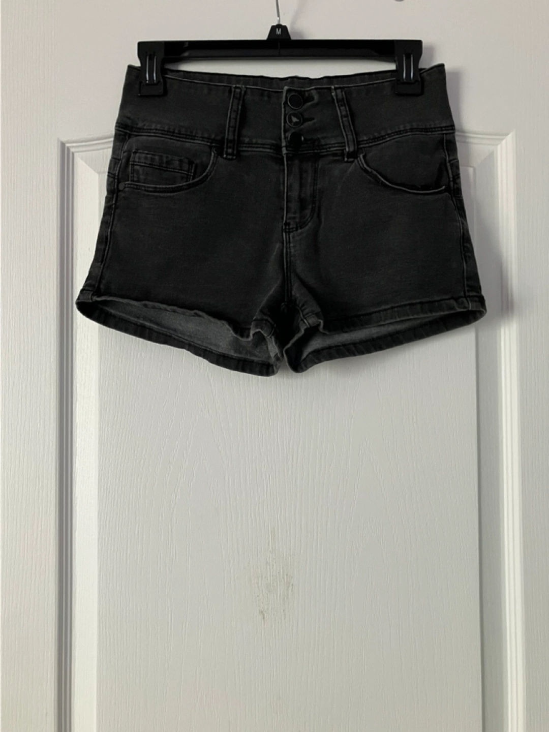 Dark grey (almost faded black) denim shorts. High-waisted with a button fly. Good condition, but the finish on the buttons are a little worn (see second picture).