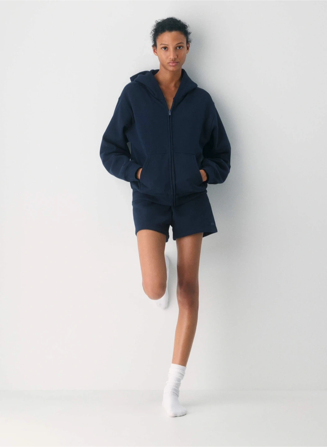 Comfortable navy blue zip-up hoodie and matching shorts set. Soft material perfect for loungewear. Hoodie features a full zip and pockets. I want the hoodie but my mom got me the zip up willing to pay more on top size small