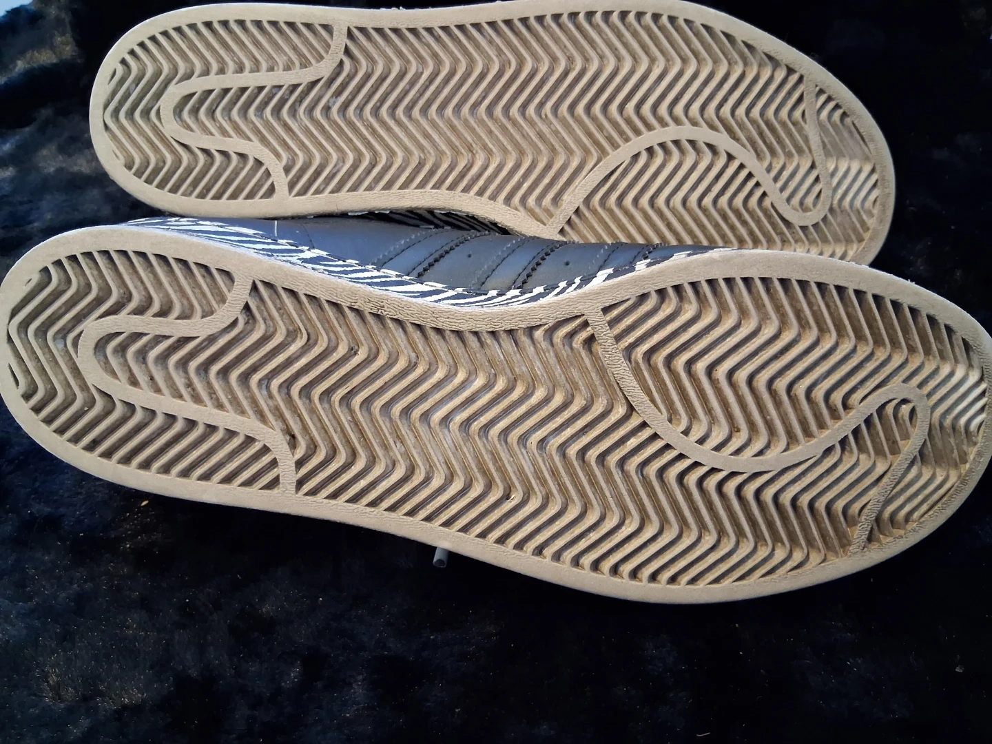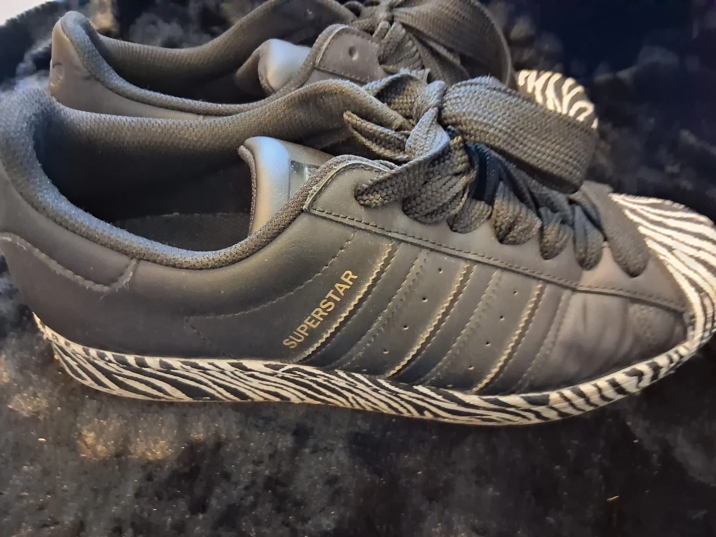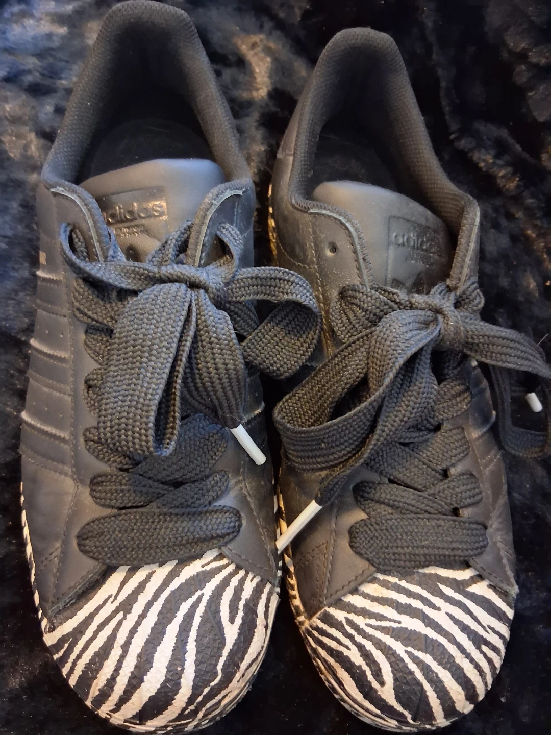 These black Adidas Superstar sneakers feature a bold zebra print toe cap and heel. They have classic three-stripe detailing. A cool addition for any sneaker collection!