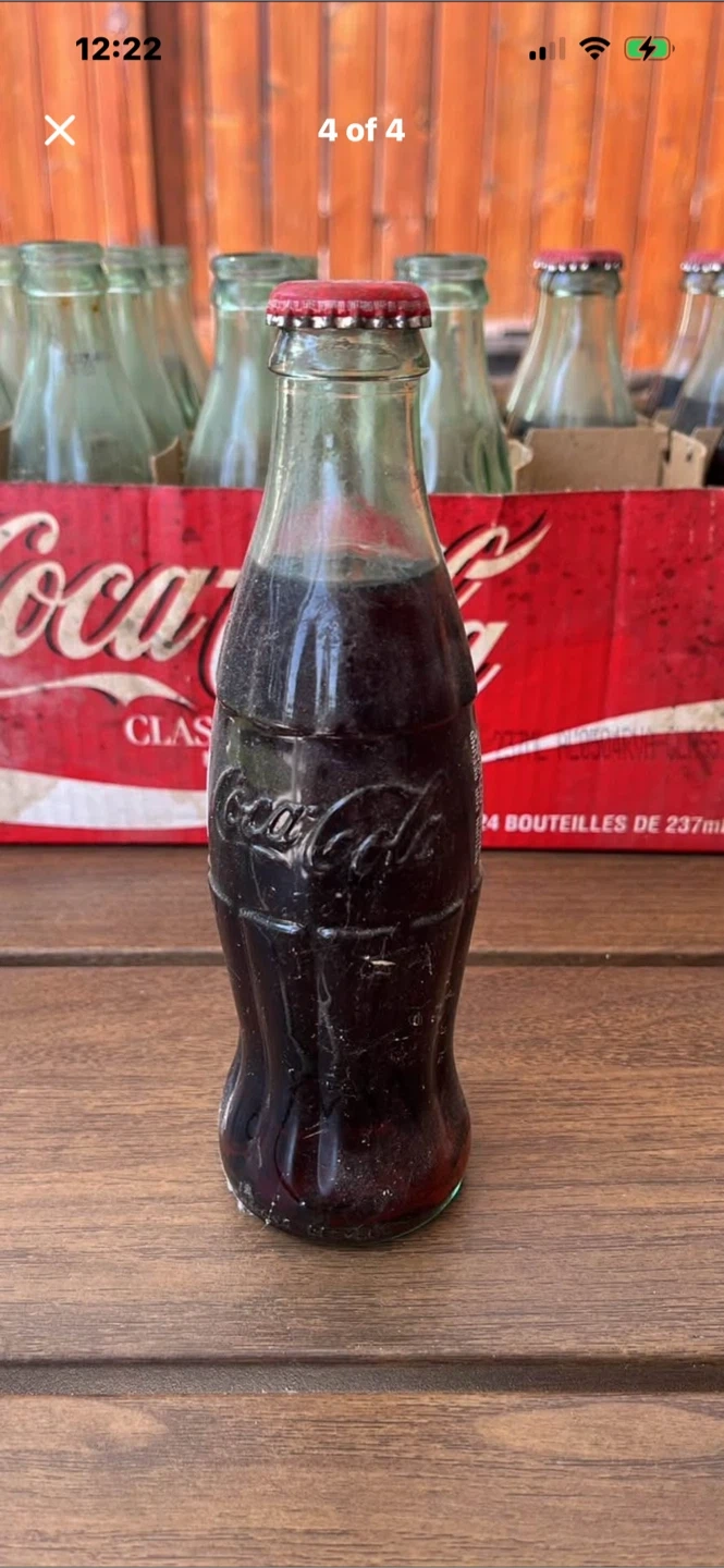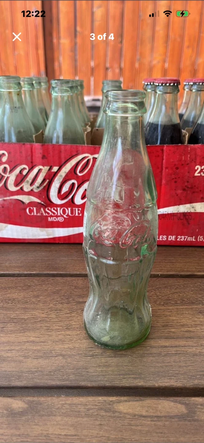 This listing includes a vintage Coca-Cola Classic crate with 24 empty glass bottles. Each bottle has a 237ml capacity. The crate shows signs of wear consistent with its age.