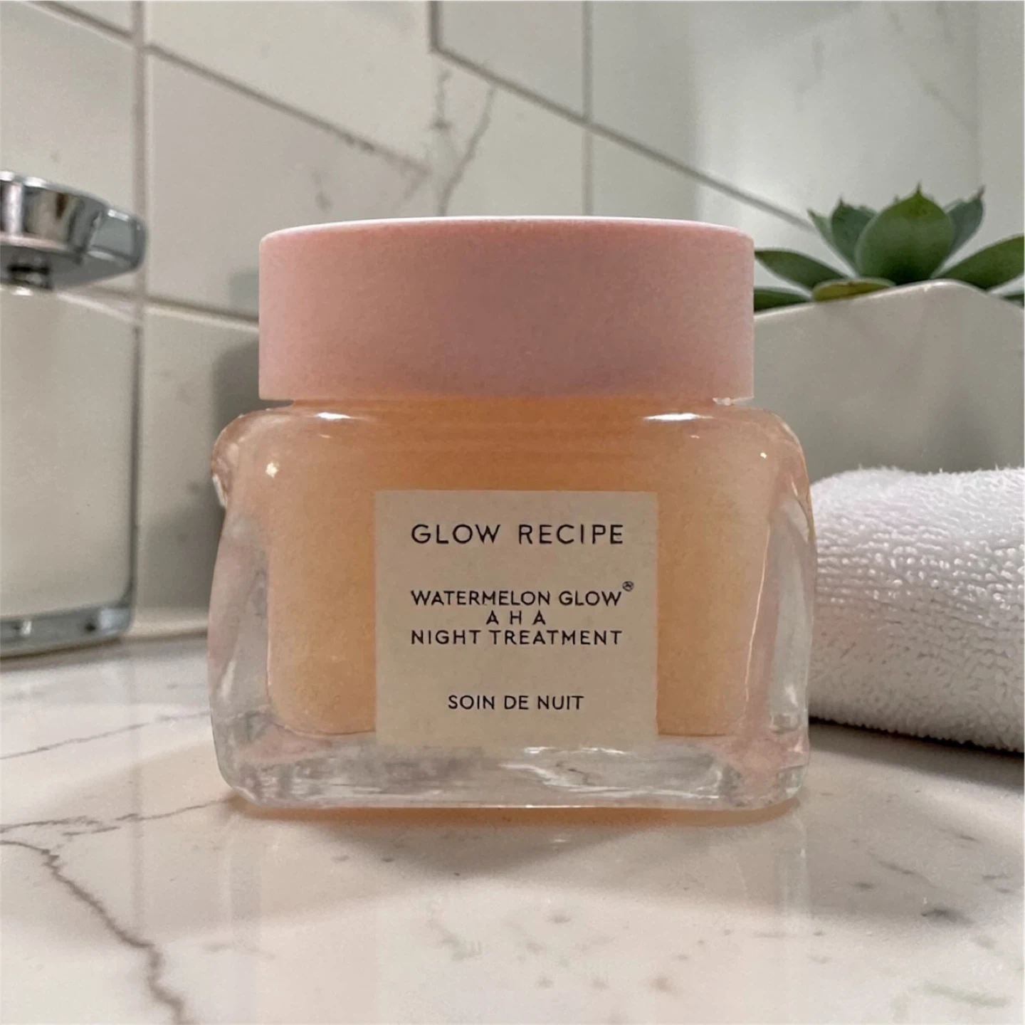 This is the Glow Recipe Watermelon Glow AHA Night Treatment. It's a skincare product for nighttime use. The formula is designed to hydrate and gently exfoliate.