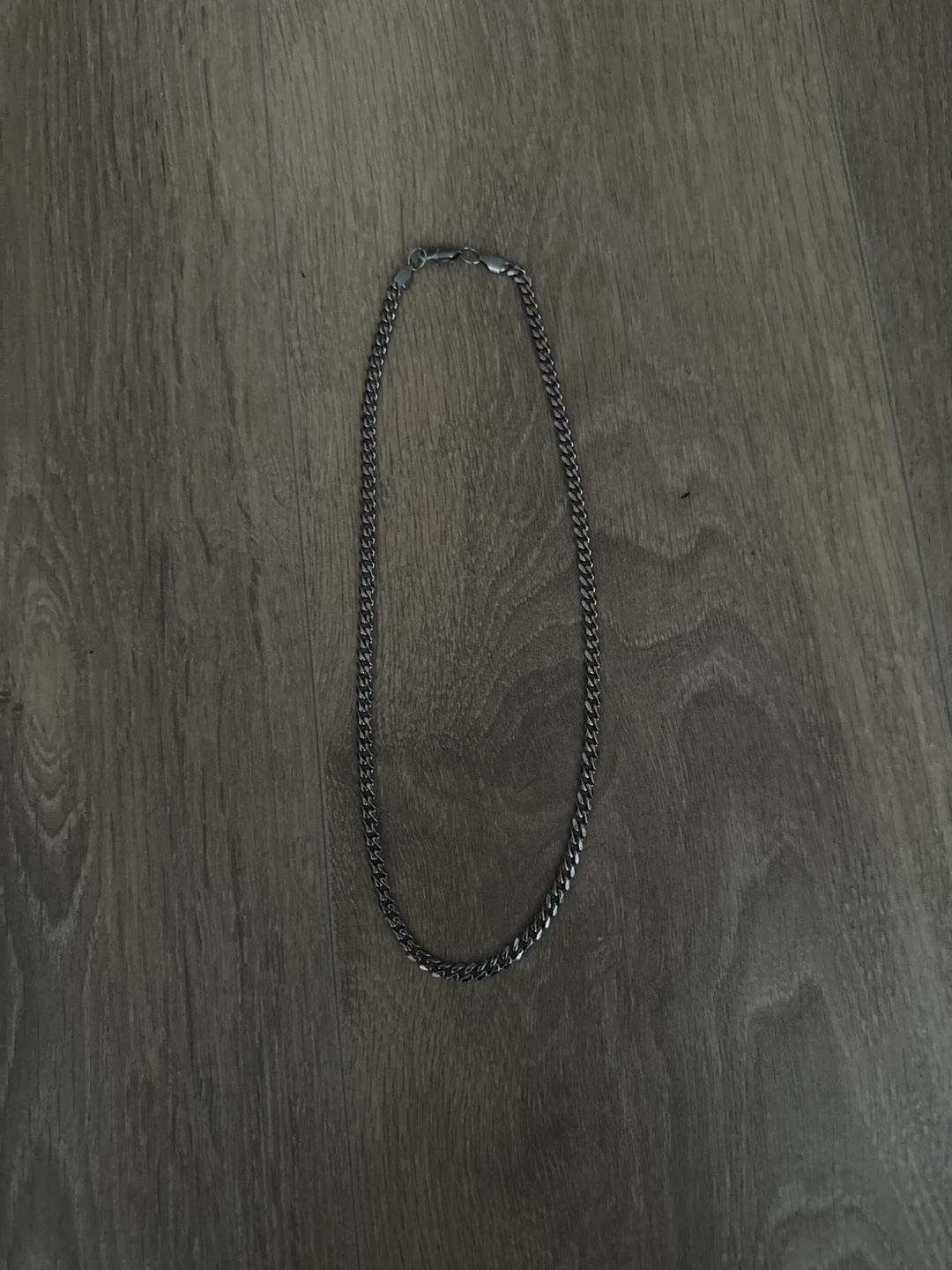 This is a men's Cuban link chain necklace. It's a standard style chain with a secure clasp closure. The metal is a dark, brushed silver tone. It's a versatile accessory for everyday wear.