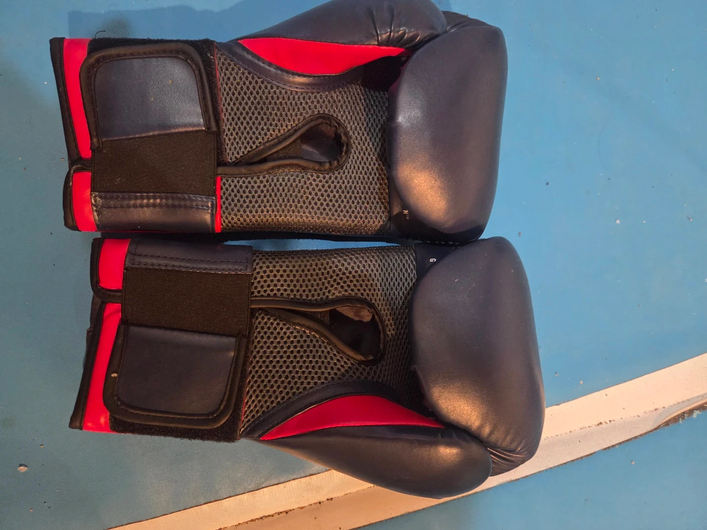 Everlast Elite boxing gloves in black and red. Size indicated as 10oz. These gloves offer good wrist support with their hook and loop closure.