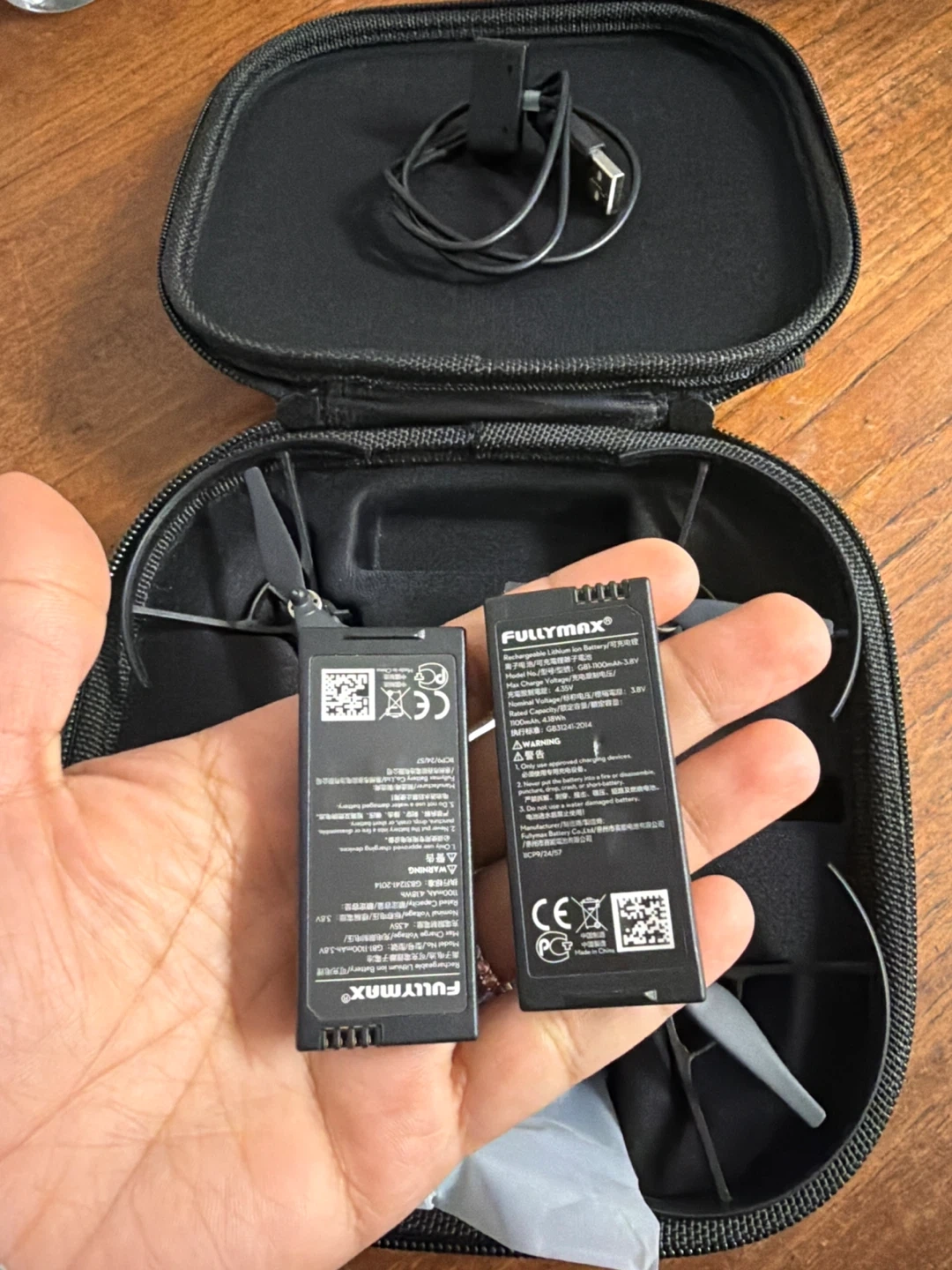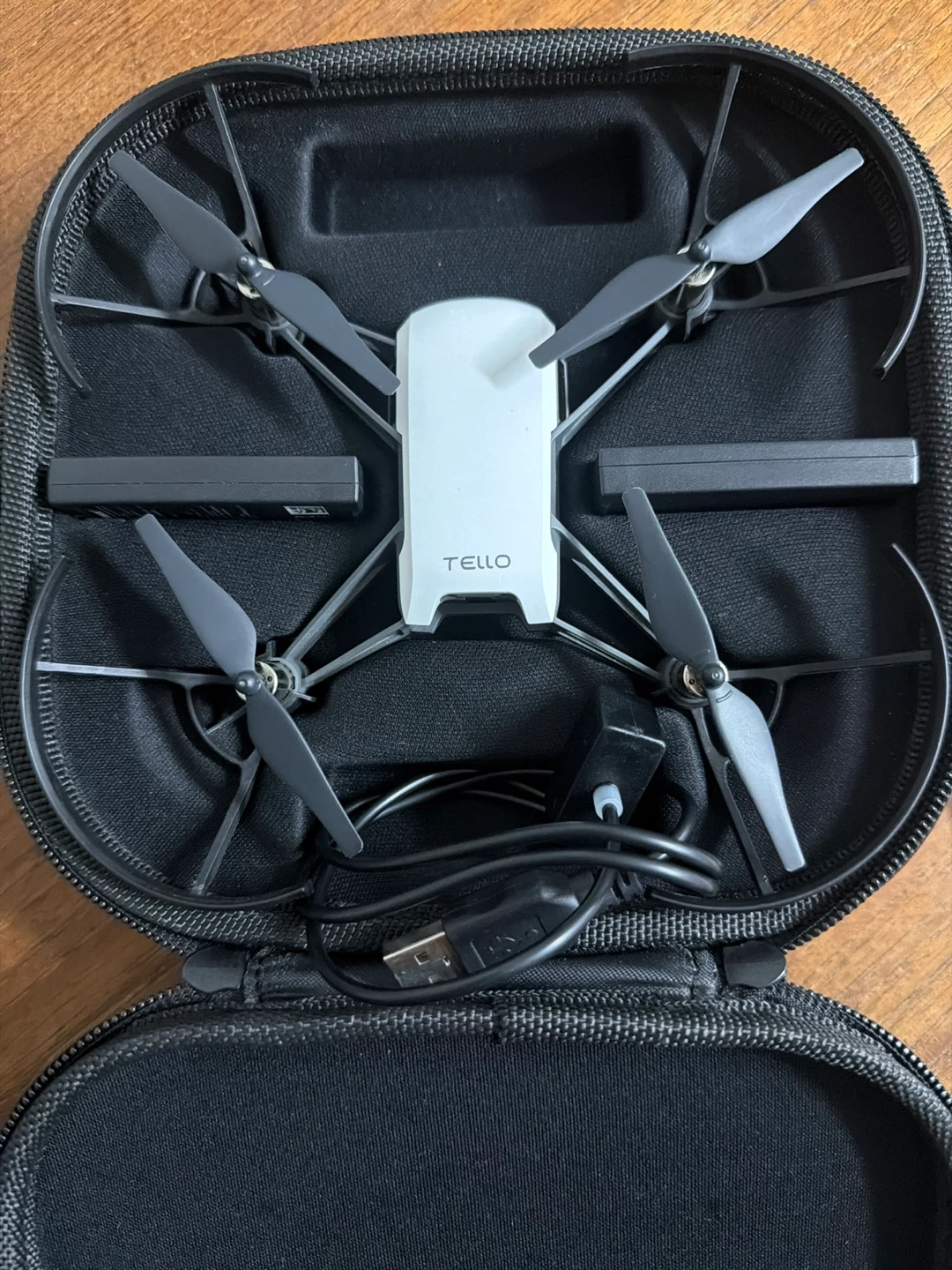 This white TELLO drone comes with a carrying case and includes a USB charging cable and two batteries. It's a compact drone for aerial photography and fun flights. Great for beginners interested in drone technology!