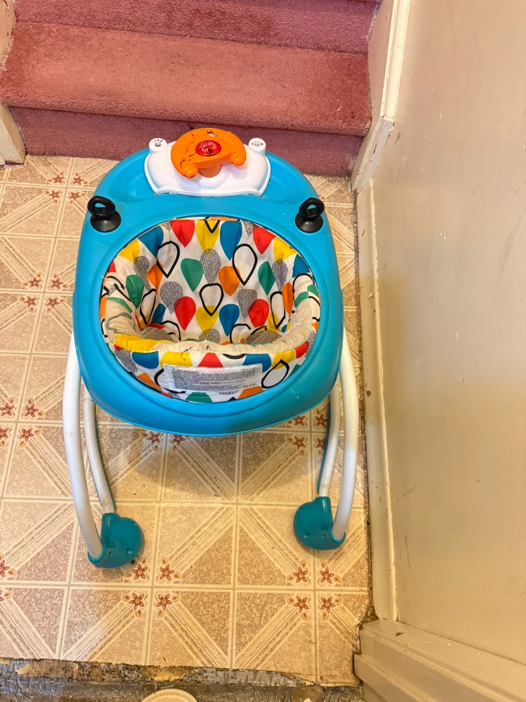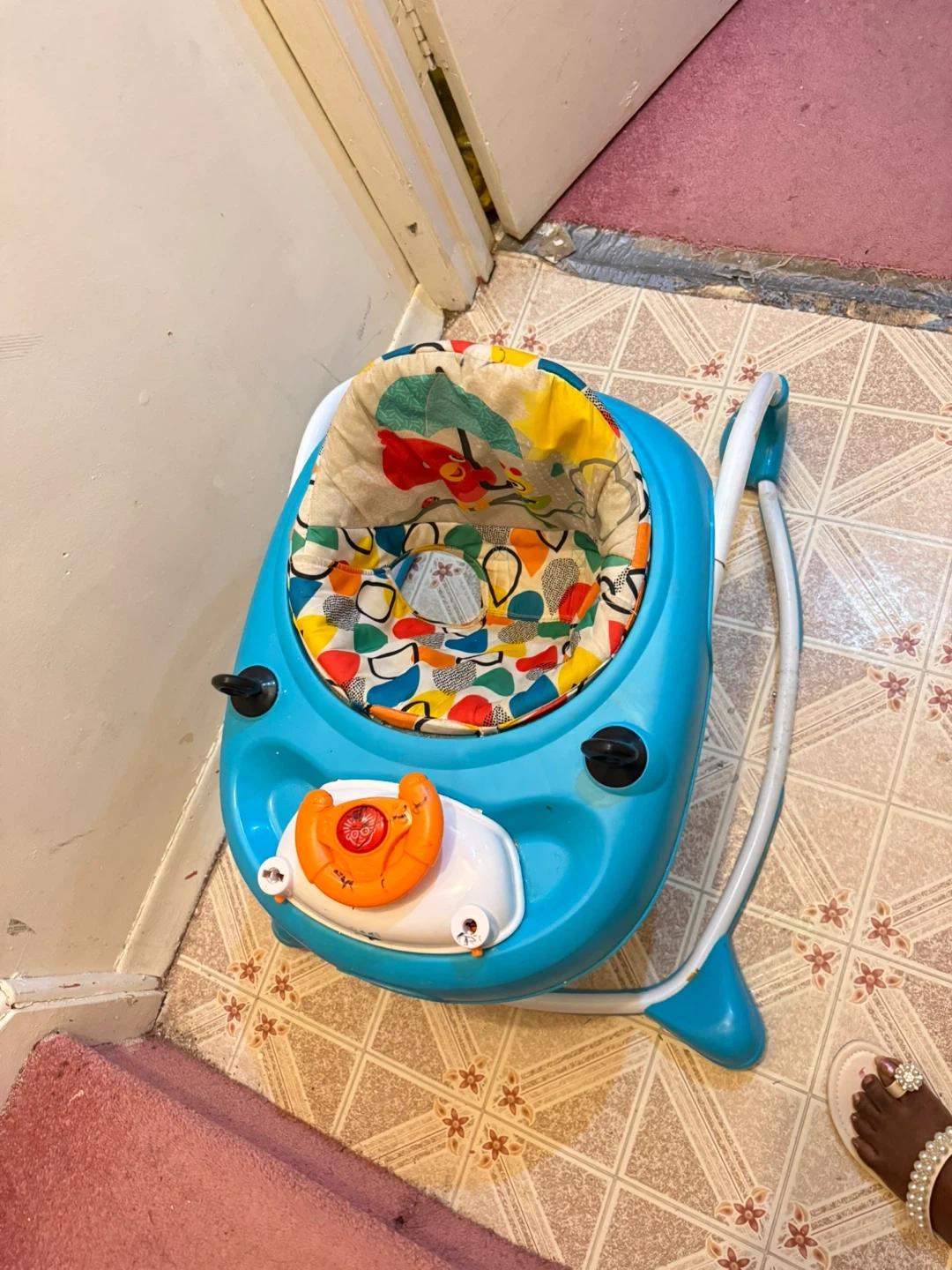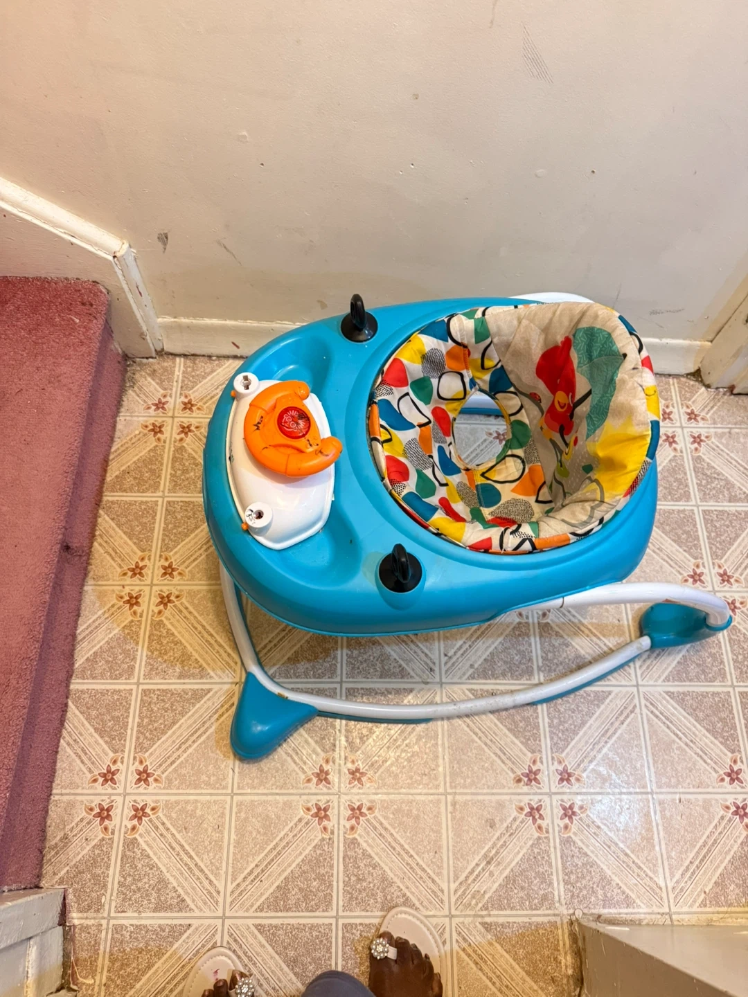 This blue Fisher-Price baby walker has a colourful seat insert with heart and teardrop shapes. It features an orange toy on the front for entertainment. It's designed to help babies learn to walk.