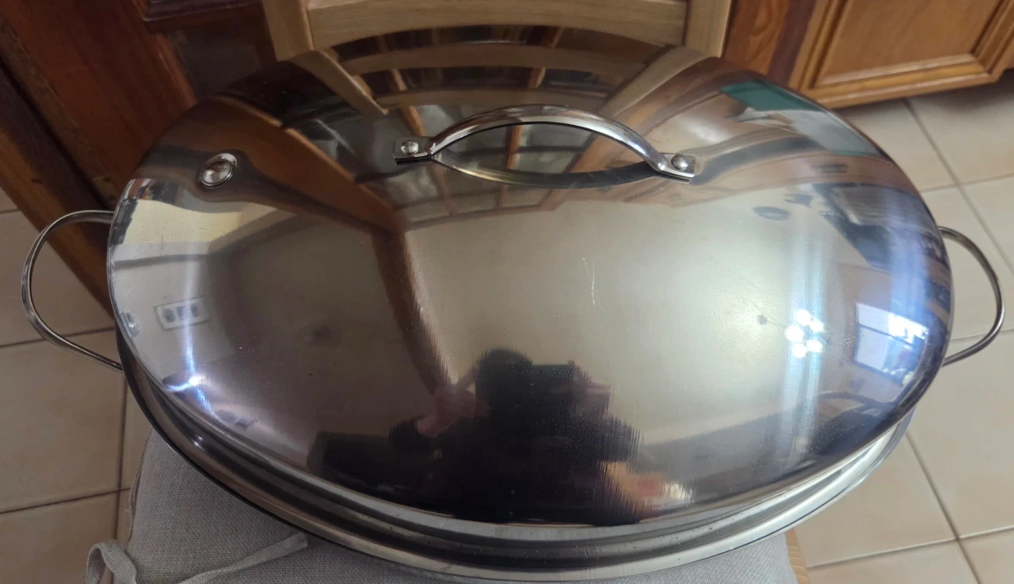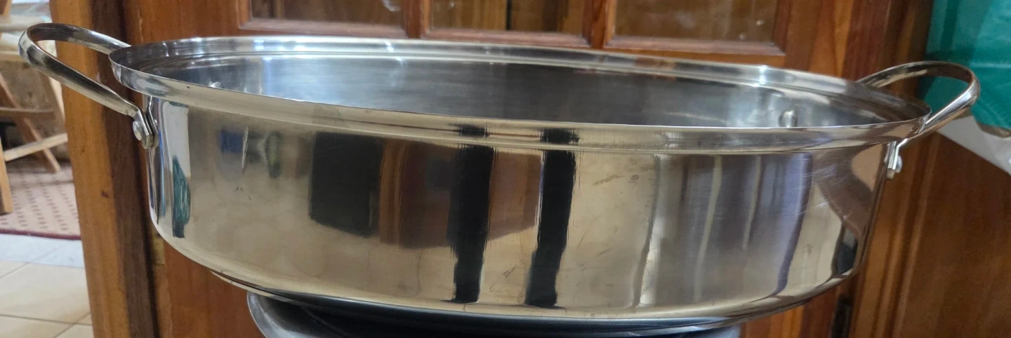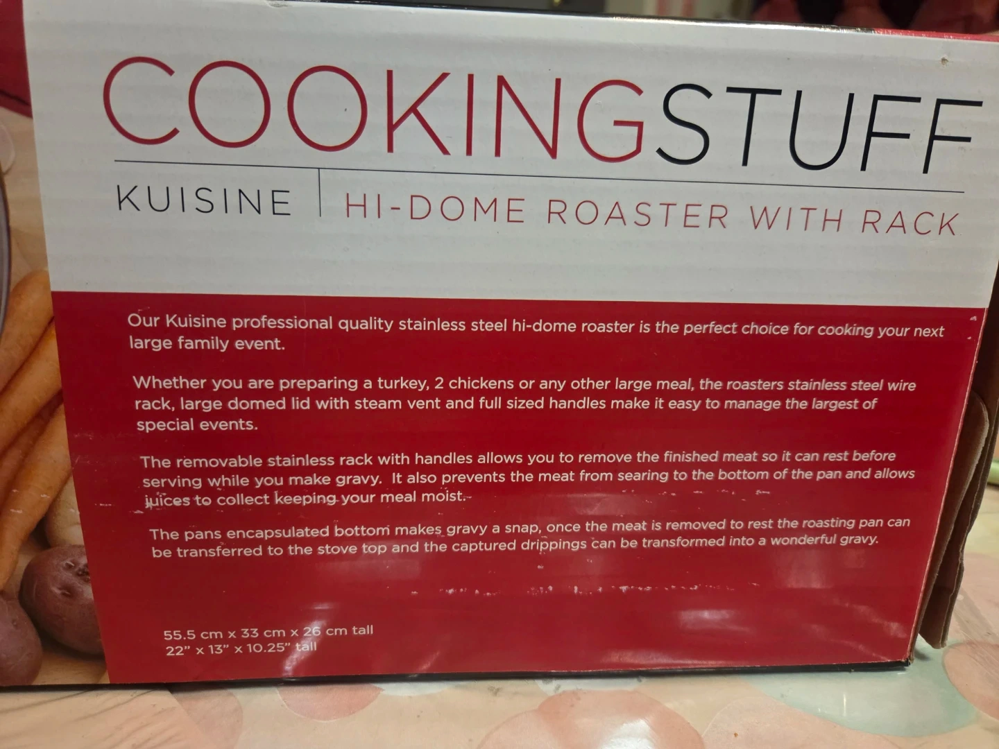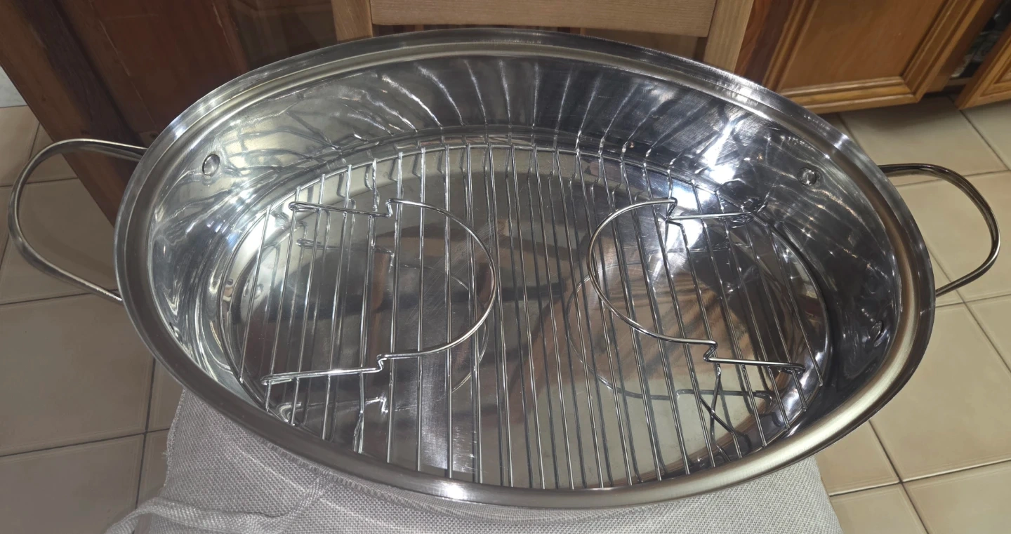 Professional quality stainless steel hi-dome roaster with removable rack. It's large enough for a turkey or two chickens. Encapsulated bottom makes gravy easily. 55.5 cm x 33 cm x 26 cm tall.
