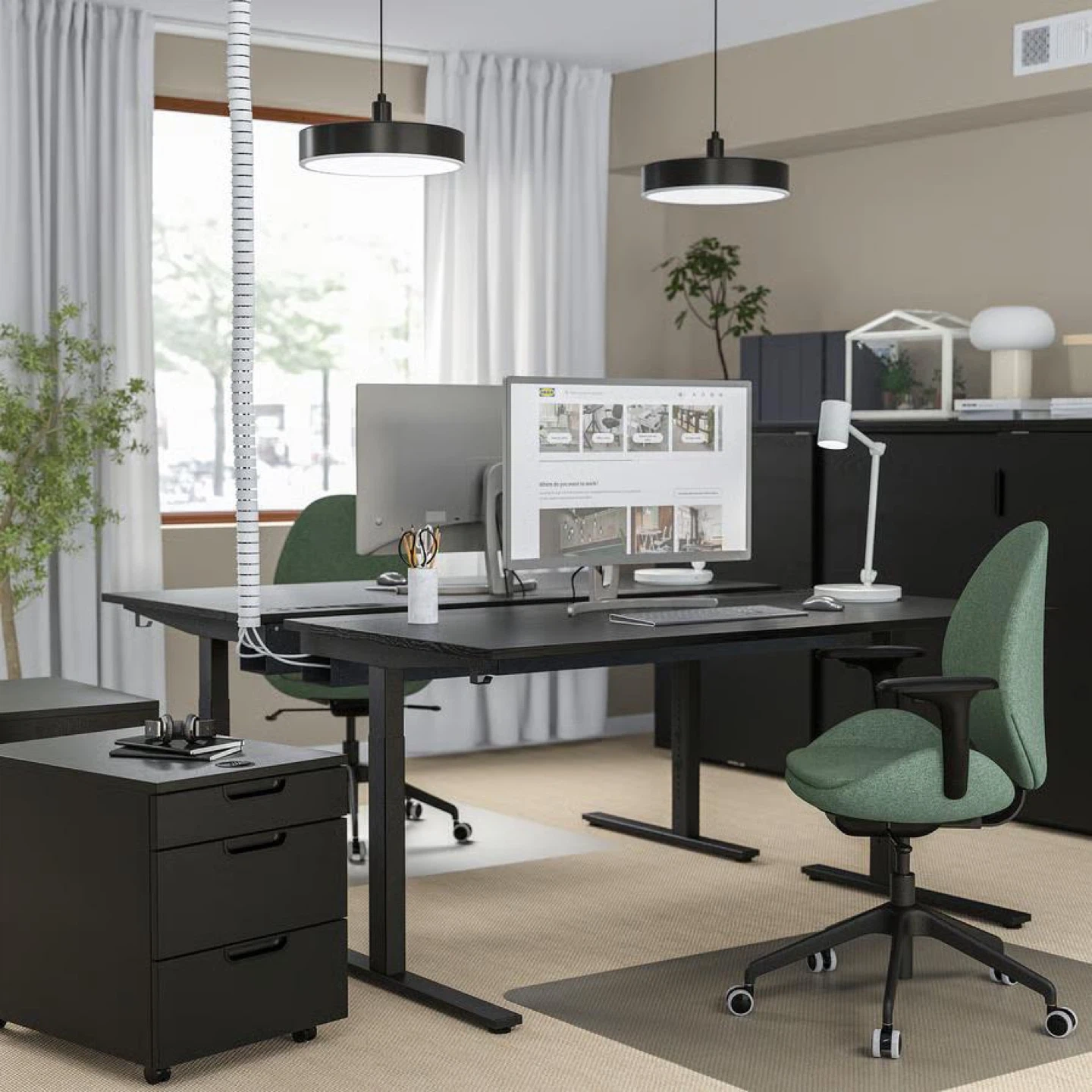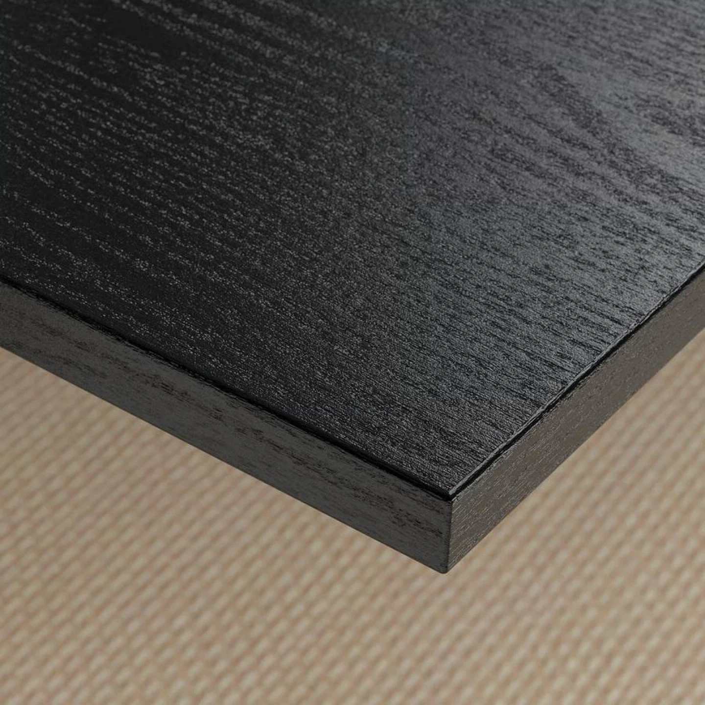 This is a black standing desk from IKEA. It measures 160 cm (63") wide by 80 cm (31 ½") deep. The adjustable height ranges from 63-83 cm (24 ¾" - 32 ⅝"). This desk is great for flexible work environments!