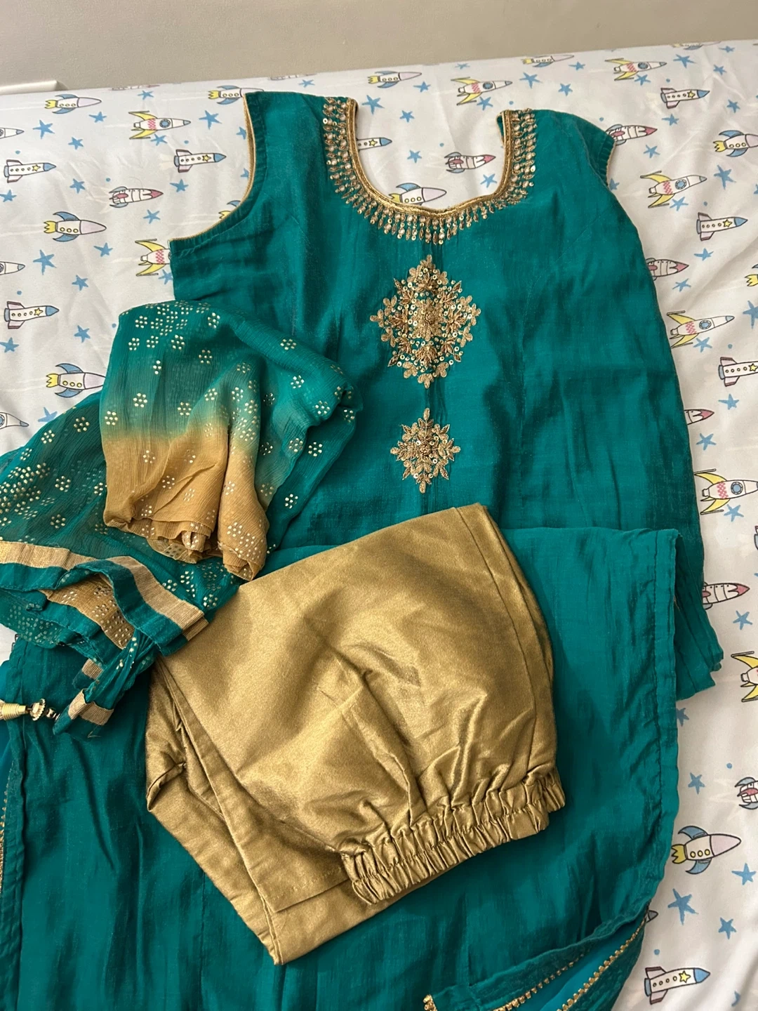 Beautiful teal coloured Indian salwar kameez set with gold embroidery and embellishments on the neckline and front. Includes a matching teal kameez, gold salwar, and a gradient dyed dupatta with scattered gold dots. It's a gorgeous outfit for festive occasions!