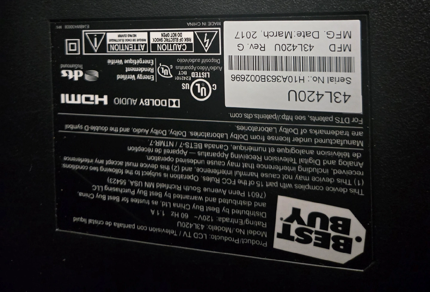 Selling a used Best Buy 43L420U 43-inch LCD TV with a sturdy silver stand. The TV was manufactured in March 2017 and is in good working condition. It's a great addition to any living room or entertainment area. Get ready for cozy movie nights! * Model: 43L420U * Size: 43 inch * Type: LCD It's still available if you're seeing this ad, so don't hesitate to reach out!