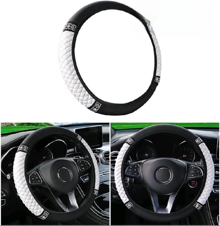 Luxury car accessory. Features a quilted design and sparkling rhinestones. Fits most standard-sized steering wheels. Stylish and comfortable.