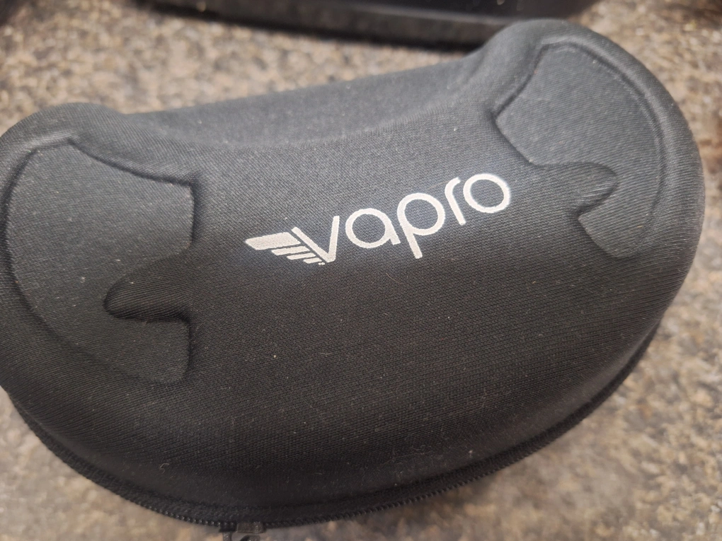 Vapro brand Snowboarding/ski glasses. Includes hard case, amber lenses, clear replacement lenses and 3x nose pieces. Adjustable strap.