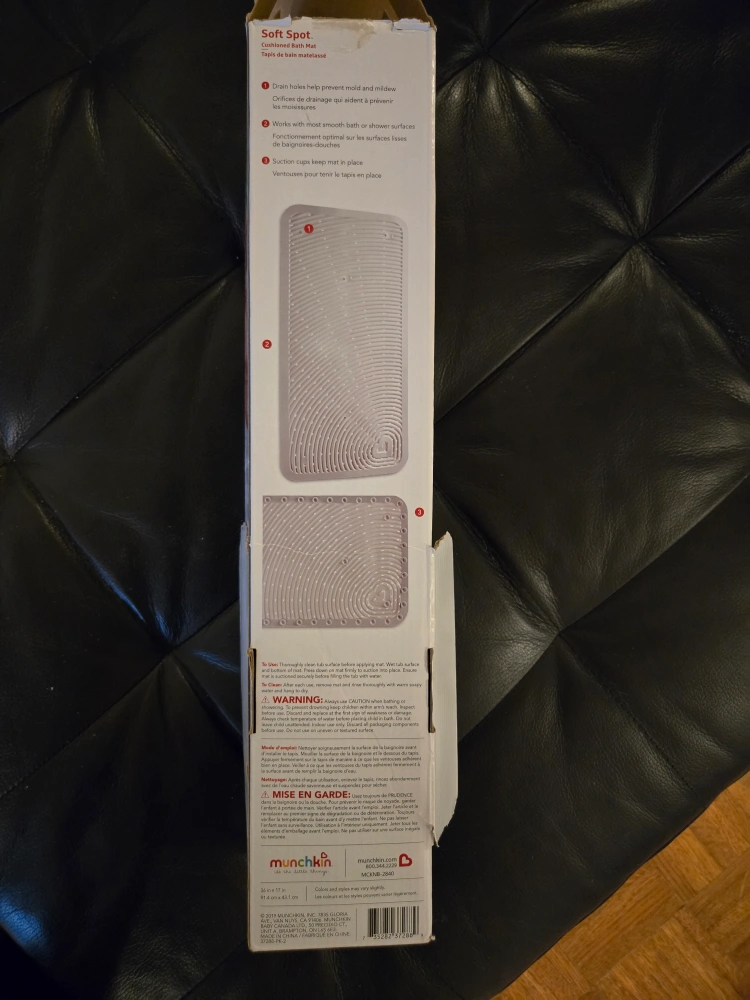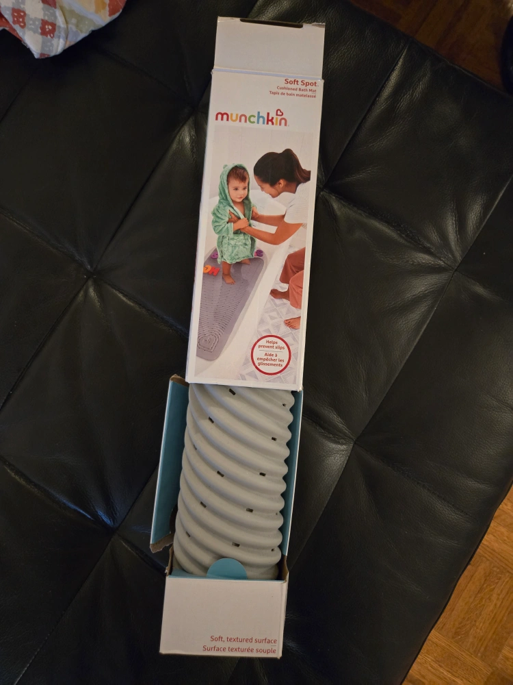 Munchkin Soft Spot cushioned bath mat. Soft, textured surface. Drain holes help prevent mould and mildew. Suction cups keep mat in place. Great for baby's bath time.