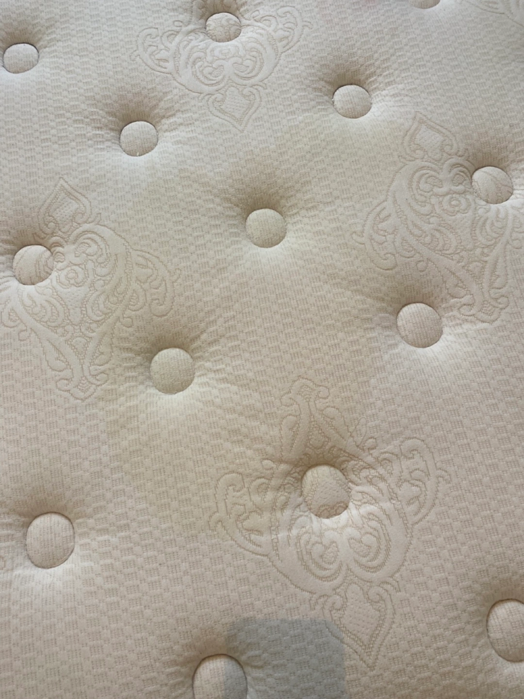 Queen mattress. Handcrafted quality. Cream coloured fabric. Some minor stains.
