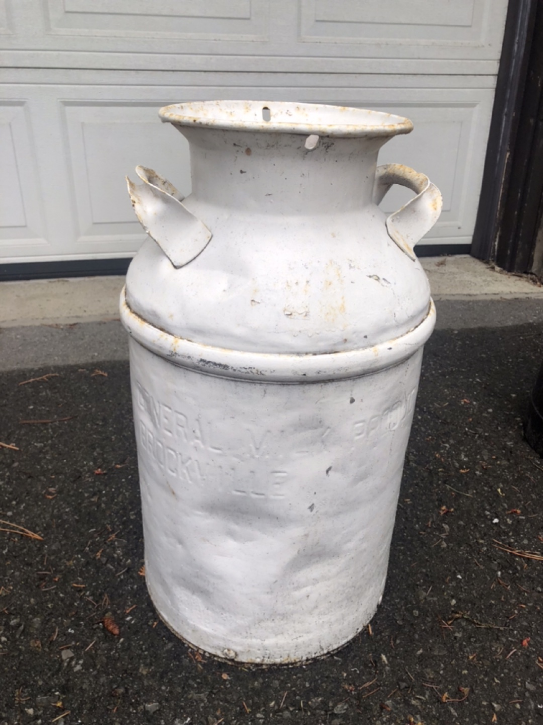 White milk can is embossed: General Milk Poducts Brockville
