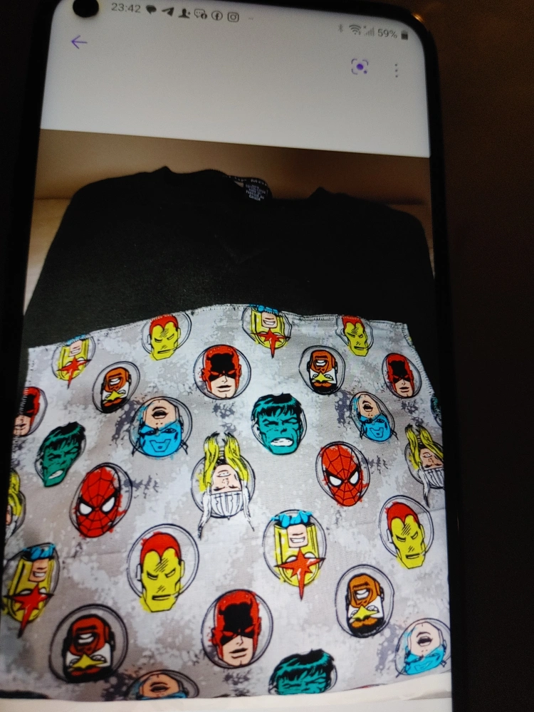 29Black V-neck t-shirt. Features a Marvel Comics character print on the bottom. Unique design.