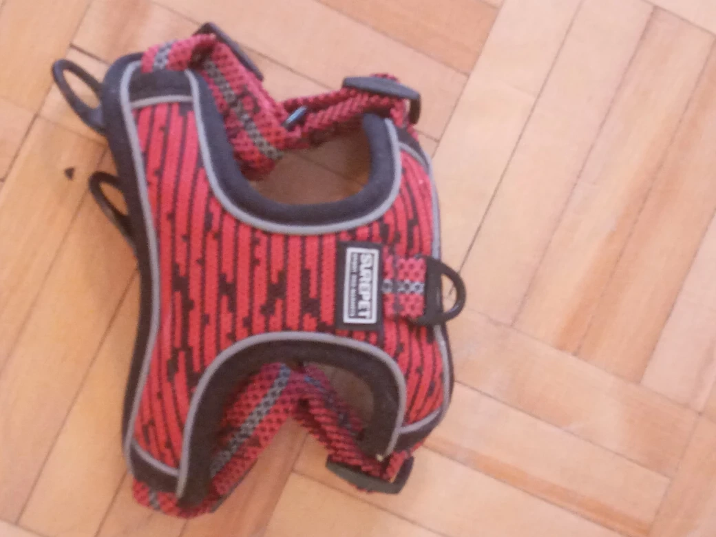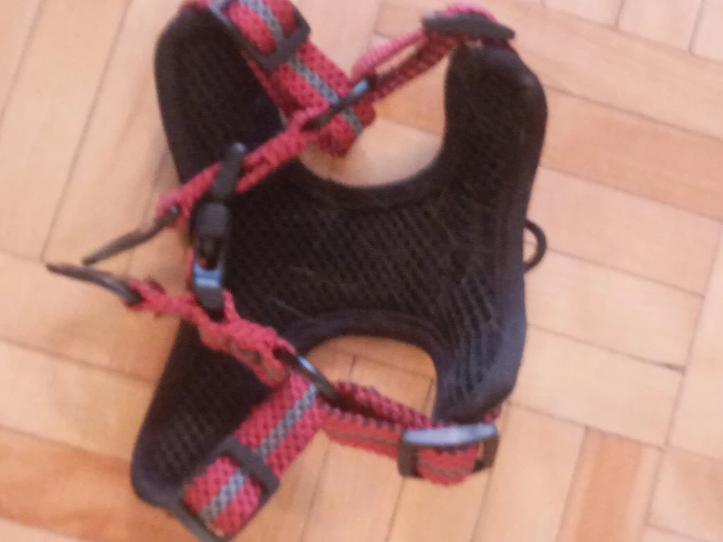 Small Pet harness. Red and black colour. Adjustable straps. Mesh padding. Good for smaller breeds.