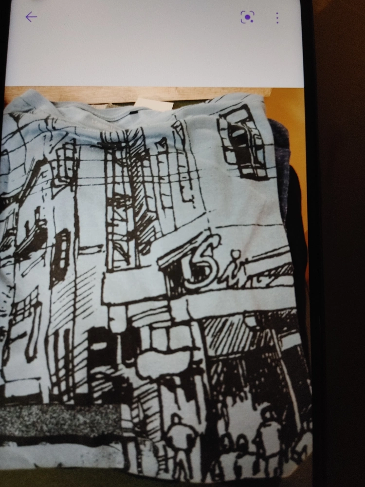 Cute light blue t-shirt. Features a graphic print of city buildings and streets. Short sleeves, crew neck. Size not specified.