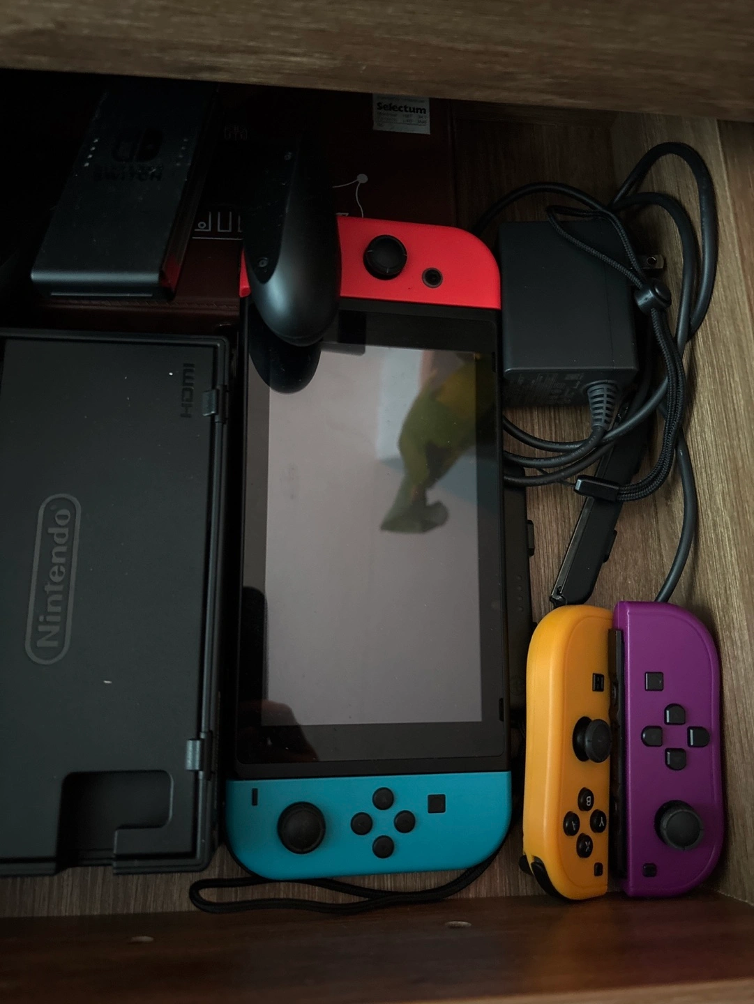 Nintendo Switch console, teal and red joy-cons, two extra joy-cons (yellow and purple), AC adapter, and tv dock. Plus I can toss in an hdmi cable. Also realized there’s a 60GB SSD in it too.