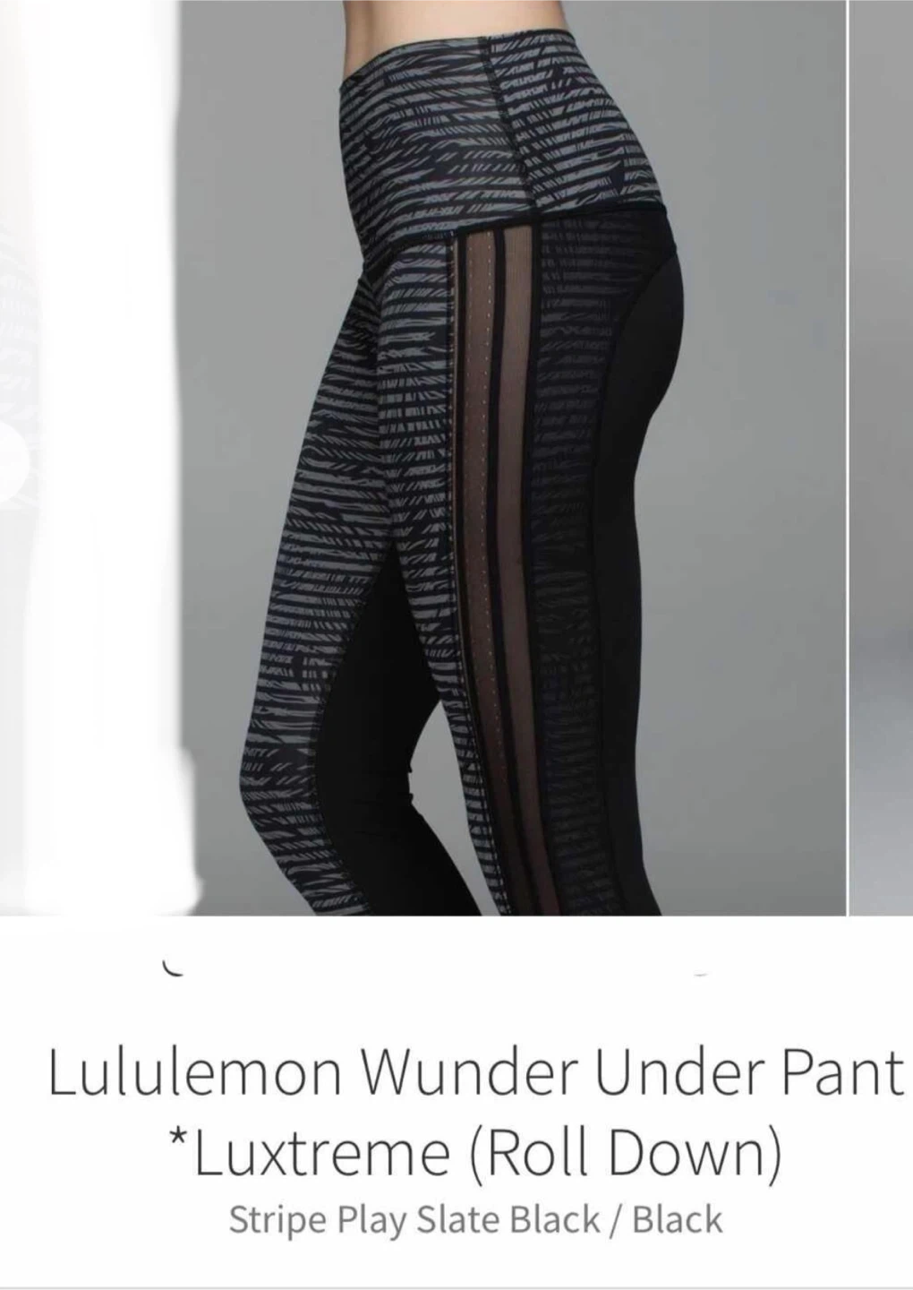 Lululemon athletic leggings. Size 8. Black with grey patterned accents. Mesh panel detail. High-waisted.