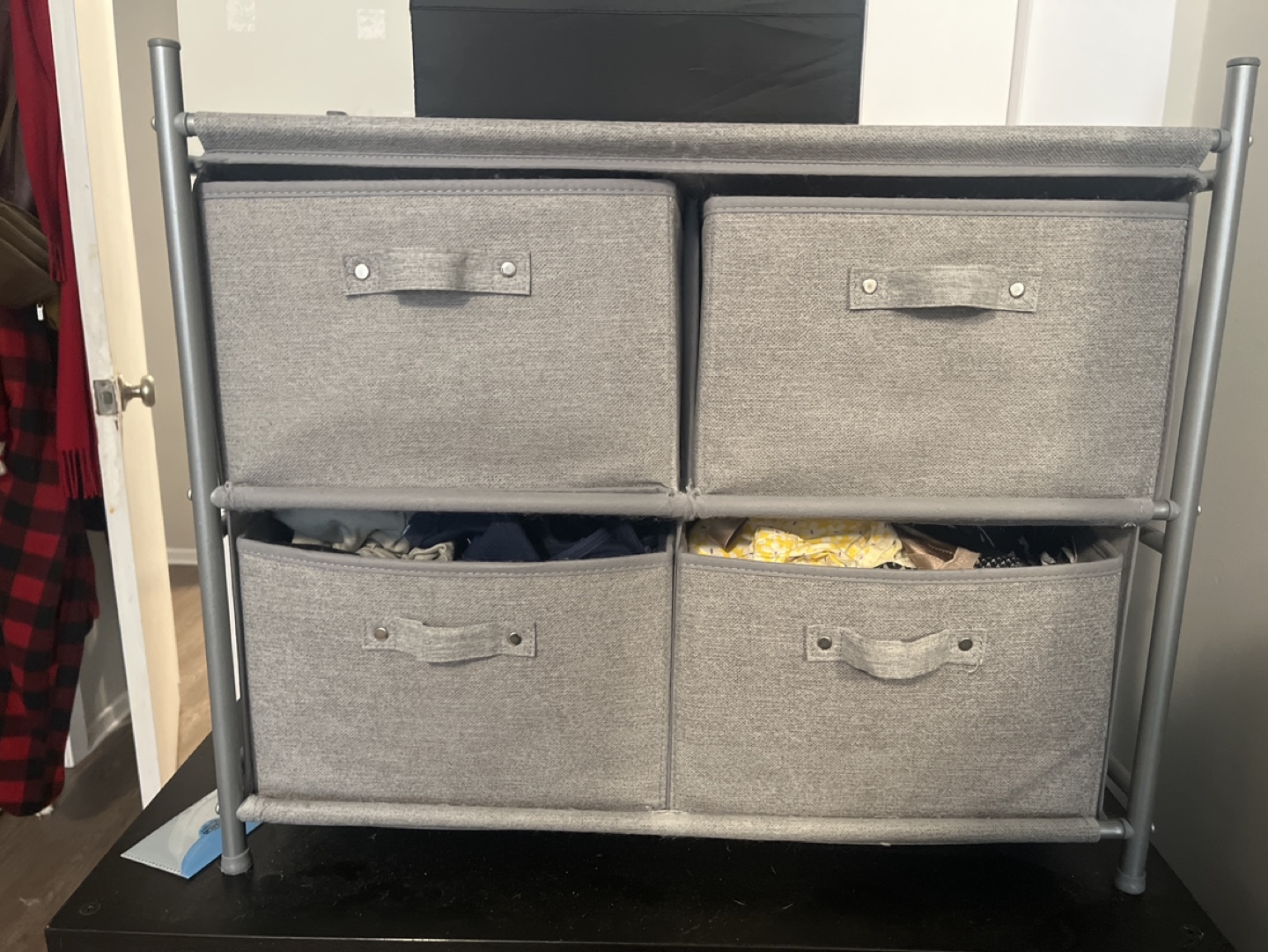 Grey fabric drawers on a metal frame. Great for organizing clothes or other items. Portable and easy to assemble.