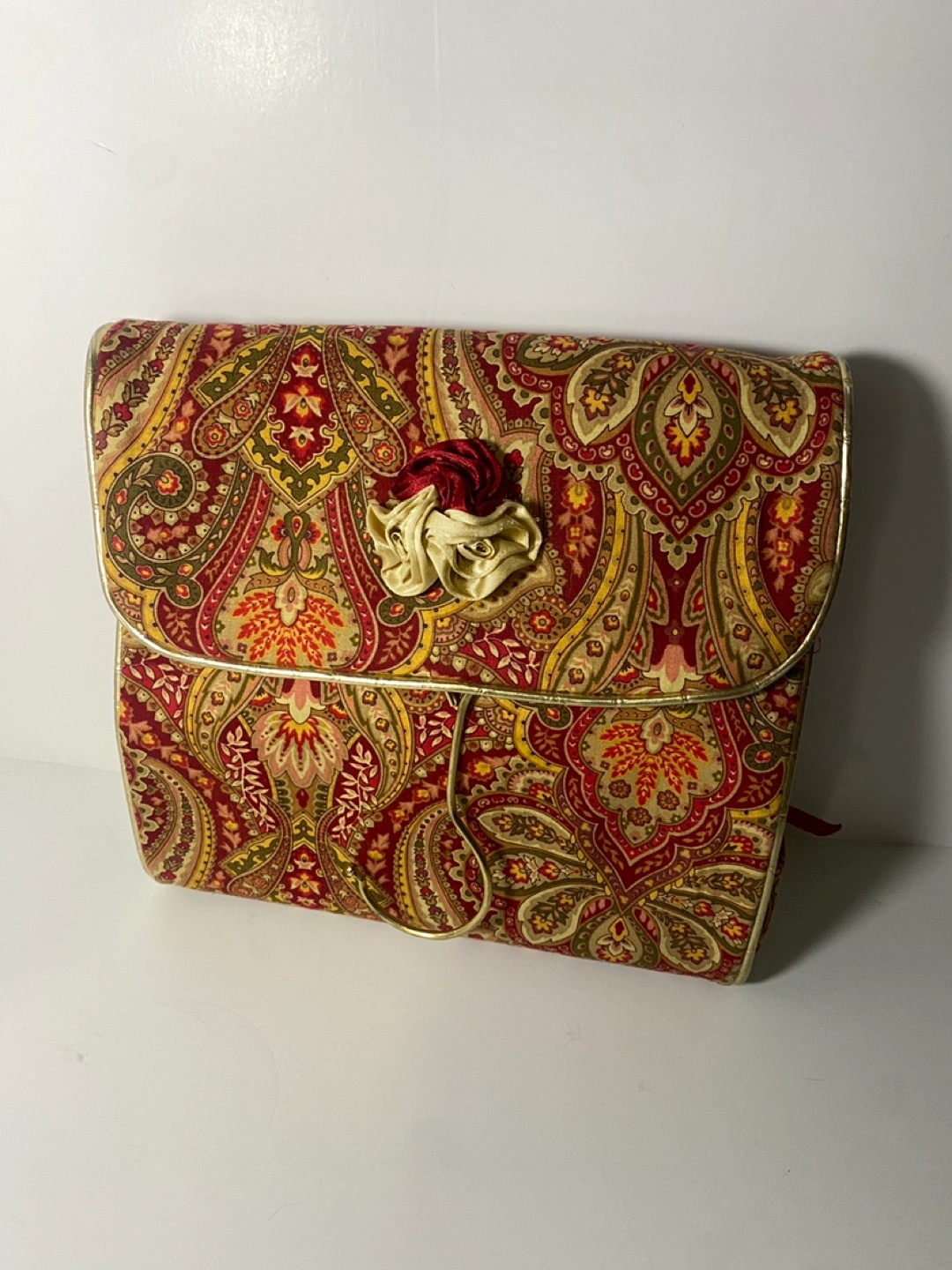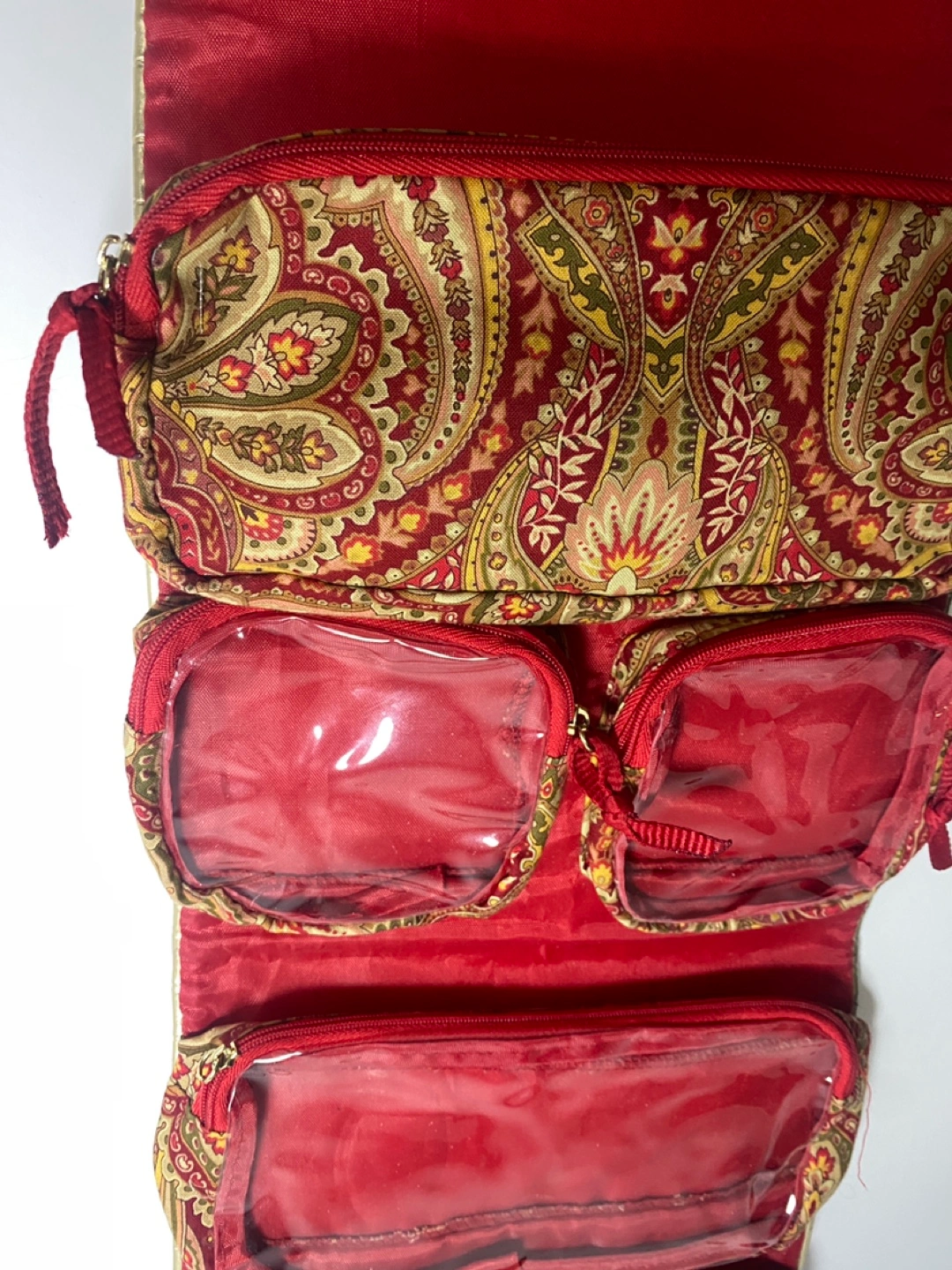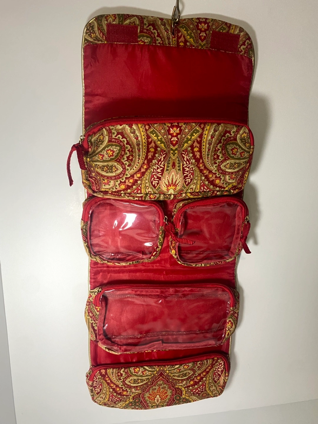 Roll-up travel cosmetic and/or jewelry bag. Red paisley print. Multiple zippered compartments. Gold metal hanger hook. Velcro closure. Great for travel! Pickup on Astoria Blvd South