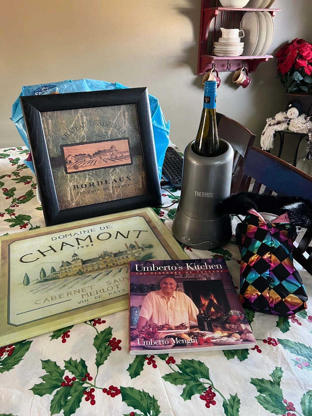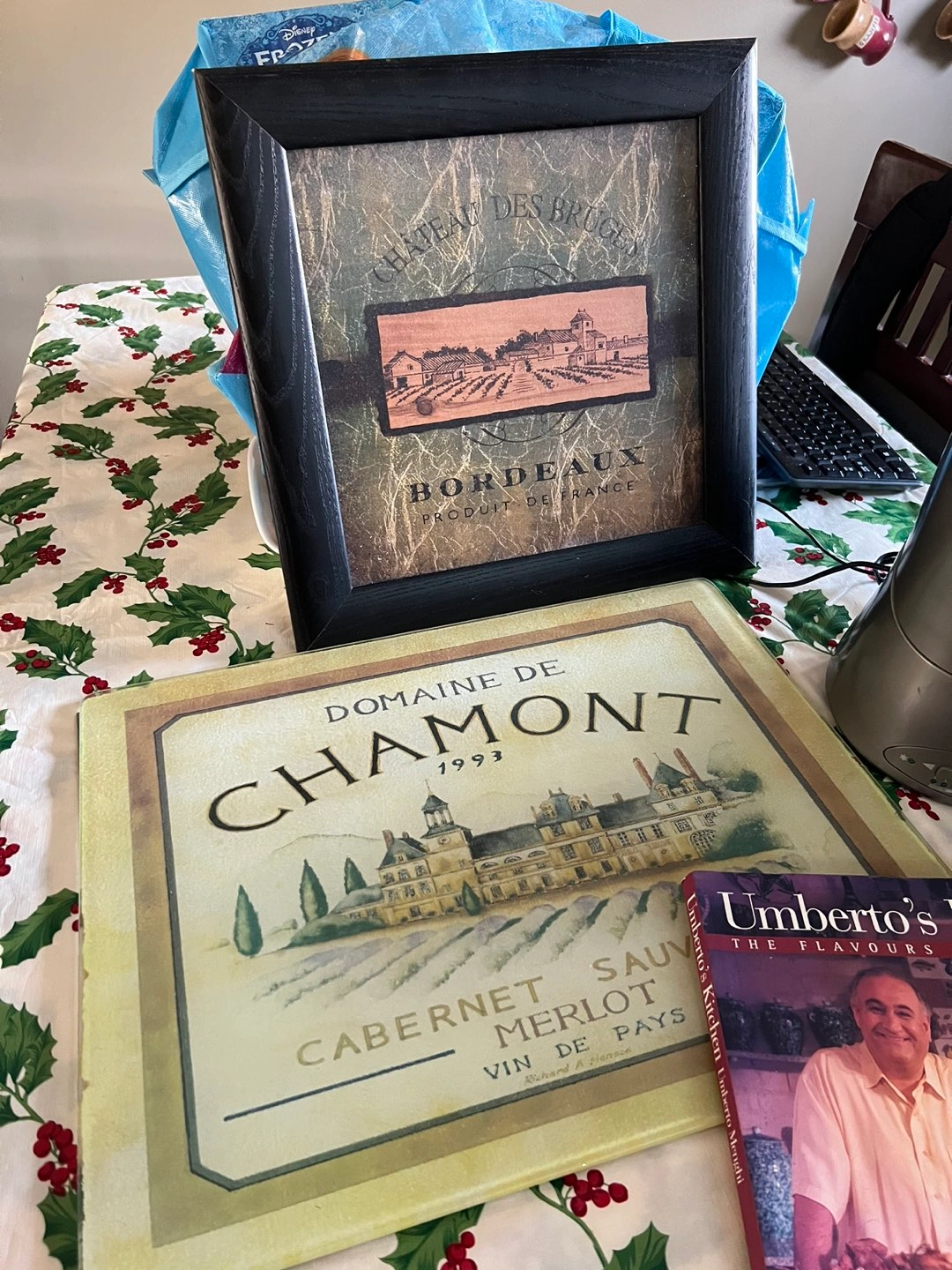 Also included is a new wine cover cozy . Merlot cutting board. Wine picture. For the wall and cookbook