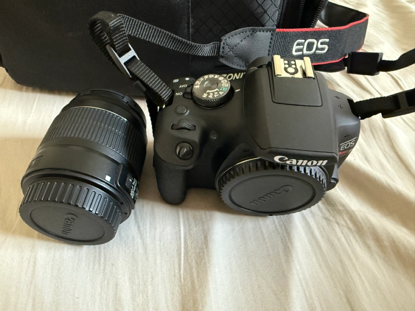 Canon DSLR camera. Includes lens and strap. Black body. Good condition.