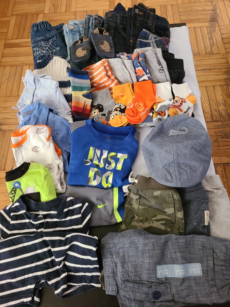 Large bundle of baby boy clothes, size 18-24 months. Includes shirts, pants, shorts, socks, and a hat. Variety of colours and patterns. Great for everyday wear.