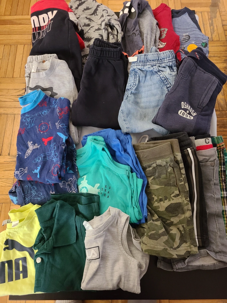 Large bundle of boys' clothing. Includes tops, bottoms, and sleepwear. Various colours and patterns. Good condition.