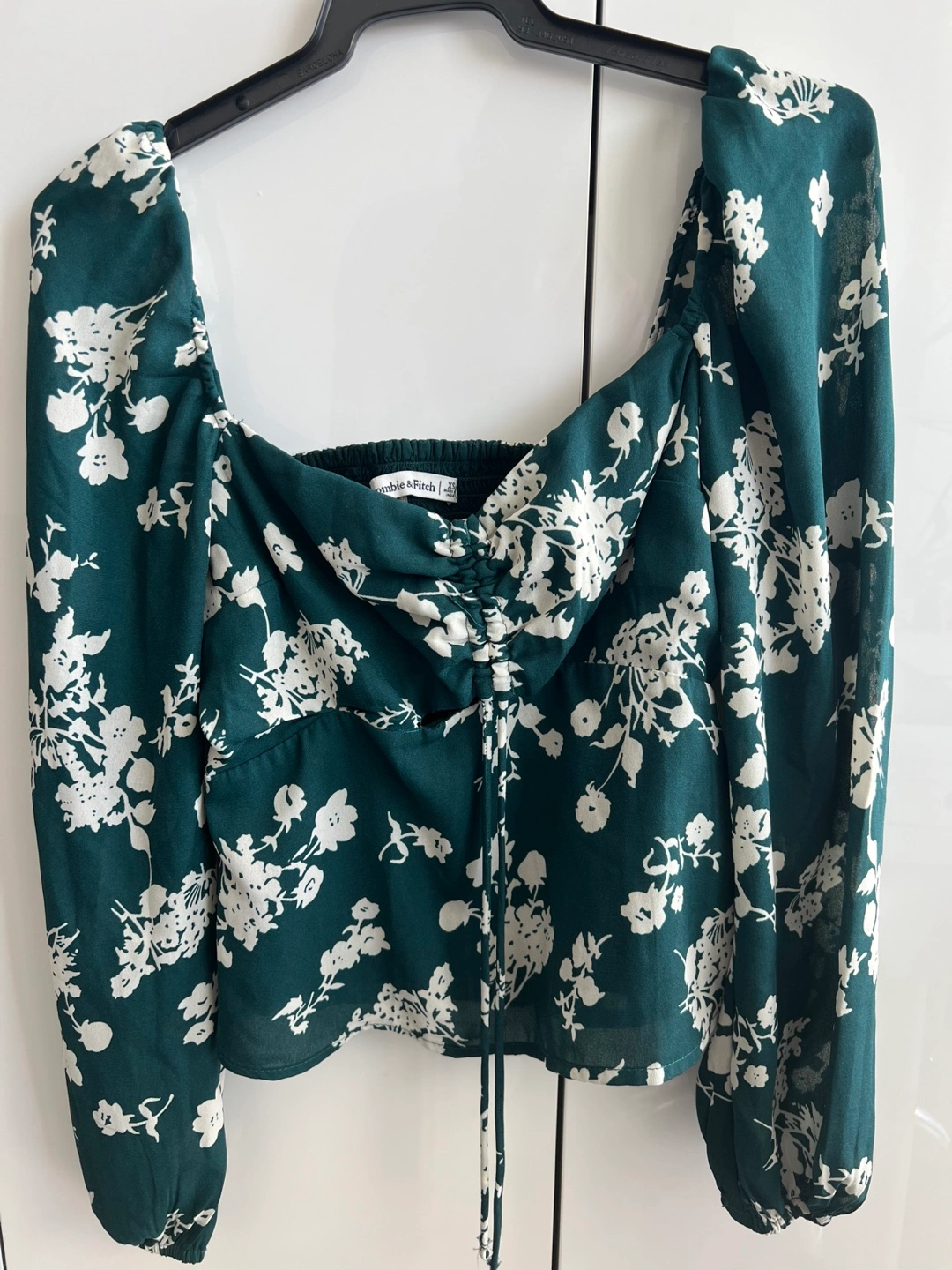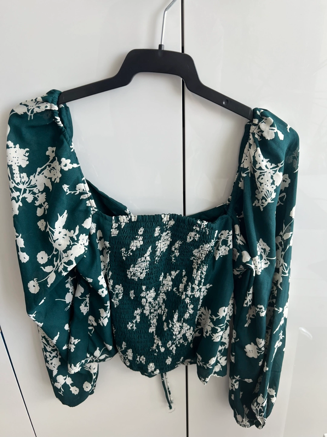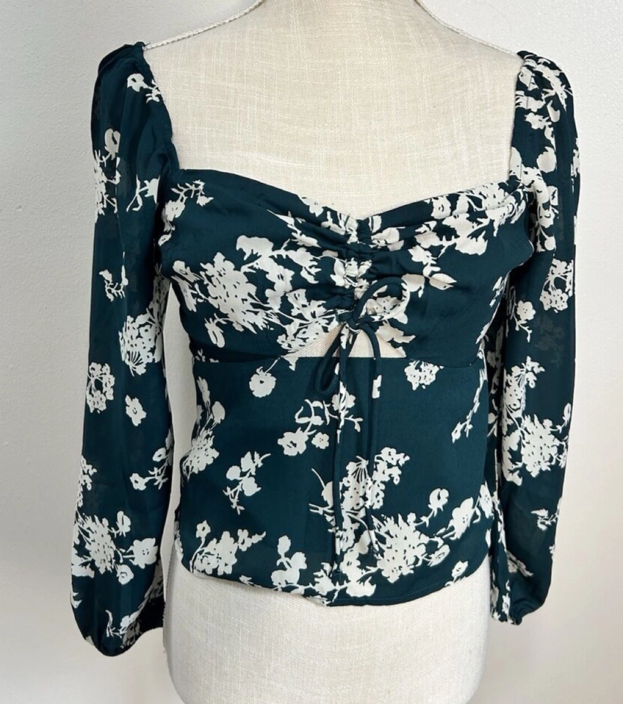 Green floral print. Long sleeves. Square neckline. Cinched waist. Lightweight fabric.