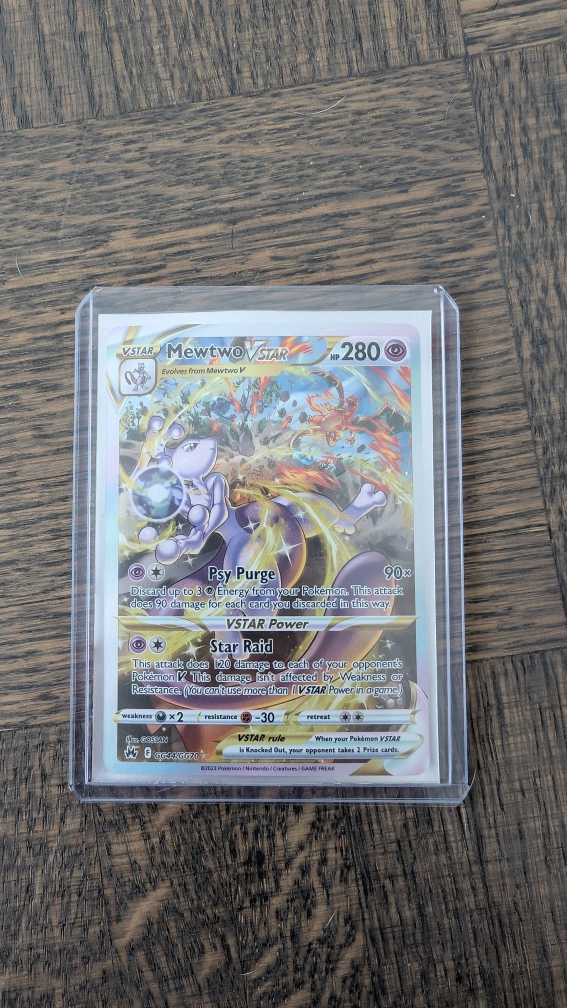 Selling a Mewtwo V-Star from the Crown Zenith Galarian Gallery. In pretty good condition, though the centering is off. Great for collectors and players alike! Message me if interested!