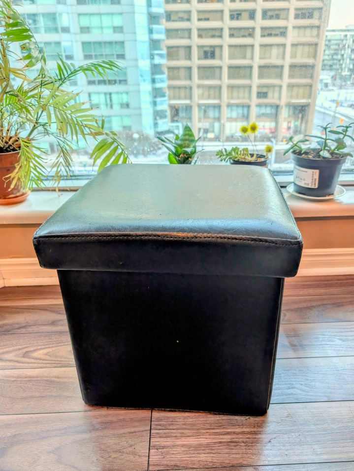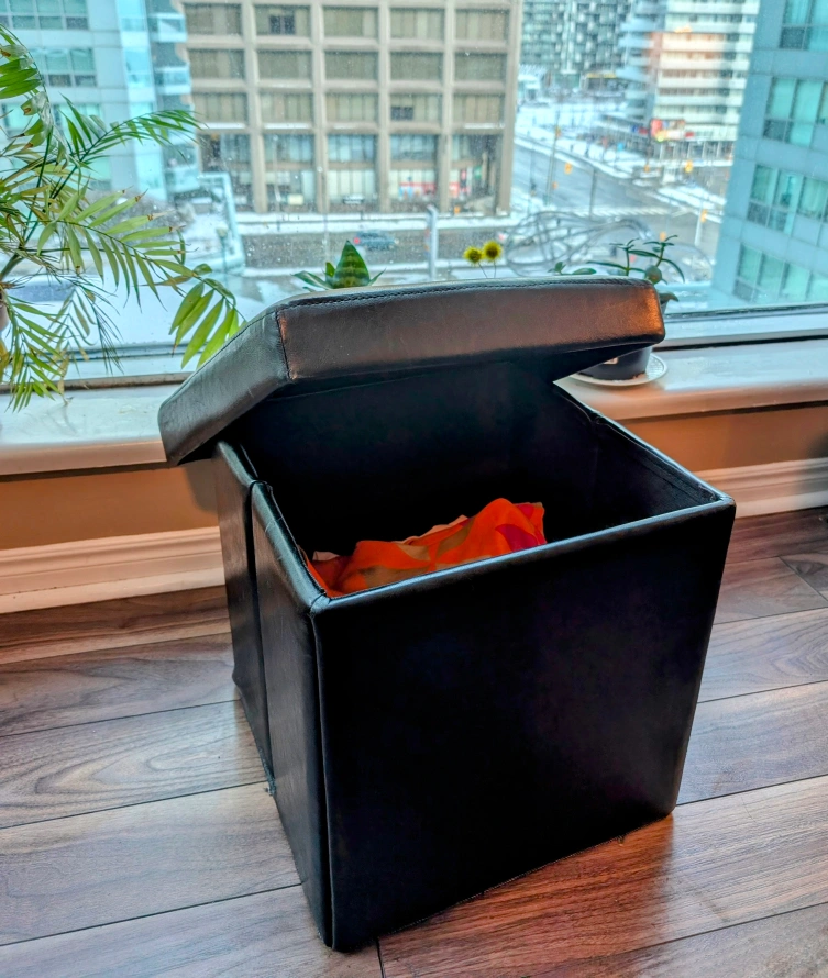 MOVEOUT SALE: Foldable storage ottoman. Black faux leather. Great for comfortable extra seating or storage.